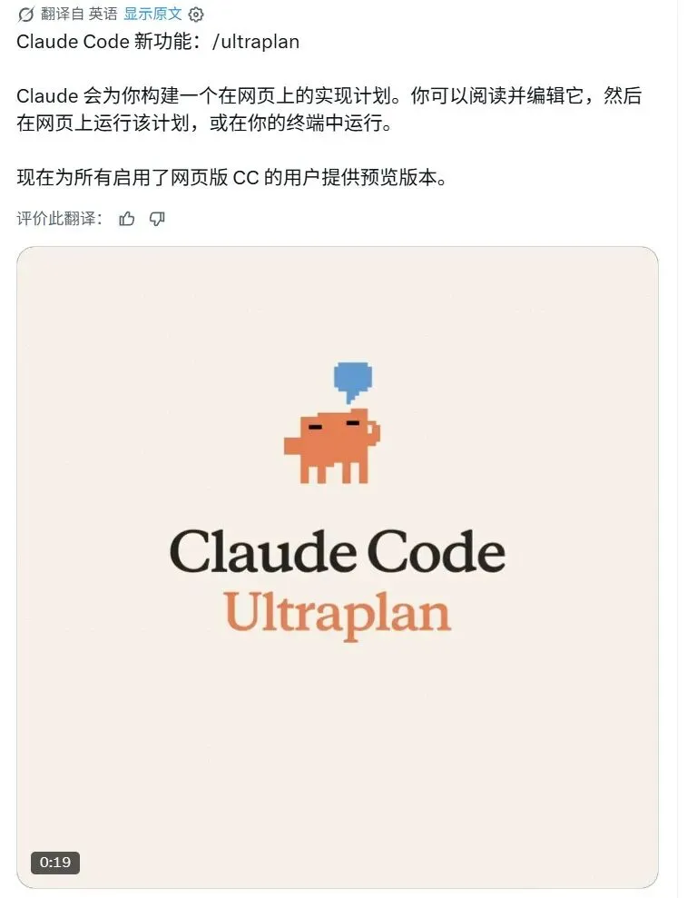 Claude Code推出新功能“Ultraplan”,支持用户在终端发起指令后,由网页端自动生成完整实施方案,并可在线编辑、远程执行或导回本地运行。该功能将“规划”与“执行”分离,现已向开启网页版Claude Code的用户开放预览。