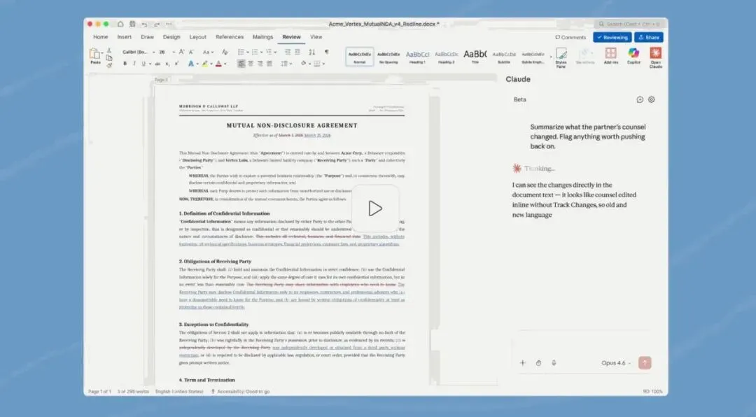 Claude 正式推出 Word 文档插件测试版。用户可在侧边栏直接完成文稿起草、编辑与修改,Claude 会自动保留原有格式,所有改动以修订追踪形式呈现,便于审阅与还原。
