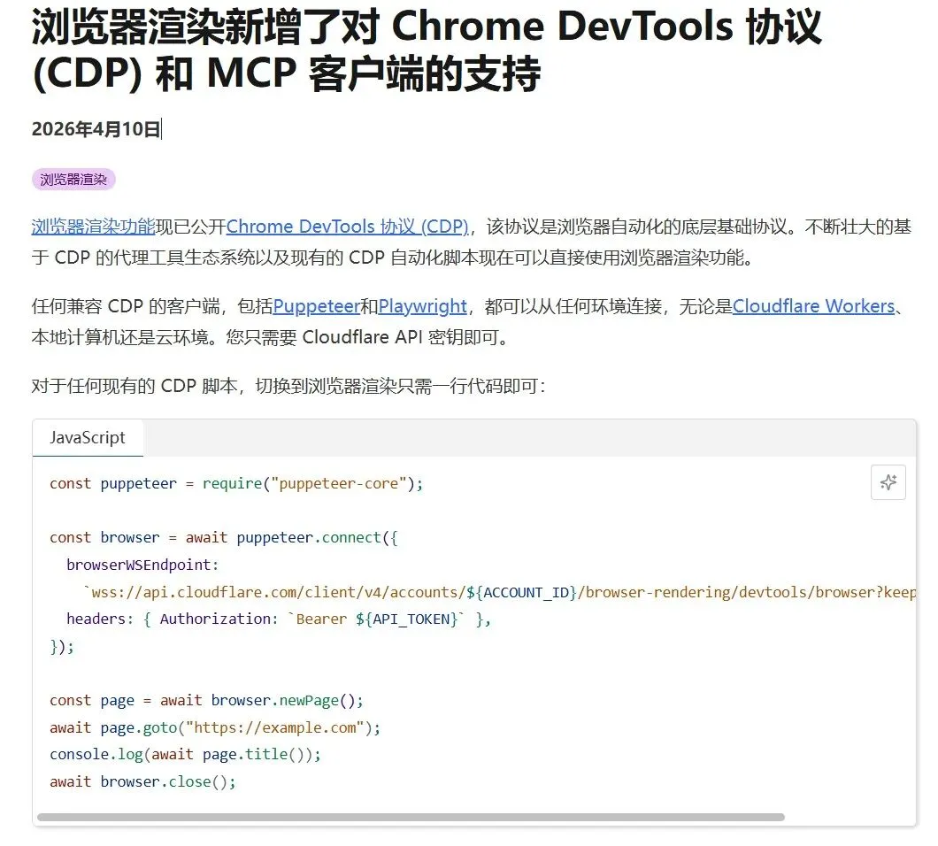 Cloudflare浏览器渲染新增CDP与MCP客户端支持