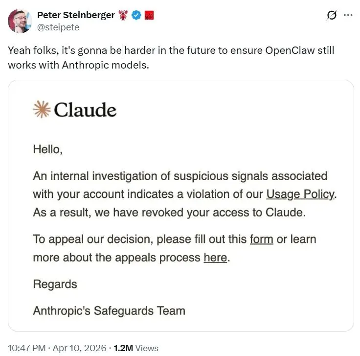 OpenClaw创建者彼得·斯坦伯格周五清晨在X平台发帖称,其Anthropic账号因“可可疑活动”被暂停,并附上相关截图。他写道:“是的伙计们,未来要确保OpenClaw仍能与Anthropic模型兼容将会更加困难。”不过这次封禁并未持续太久,数小时后账号已恢复。