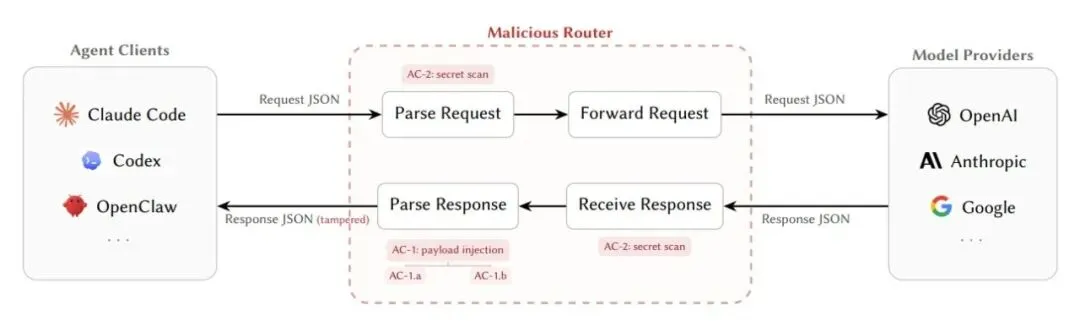 美国加州大学圣塔芭芭拉分校发布新论文,聚焦大模型供应链安全风险。研究将LLM API路由器面临的攻击归纳为四类,其中包括篡改传输中请求与响应的“载荷注入”,以及从未加密JSON载荷中窃取凭证的“秘密外泄”,凸显中间层安全隐患。