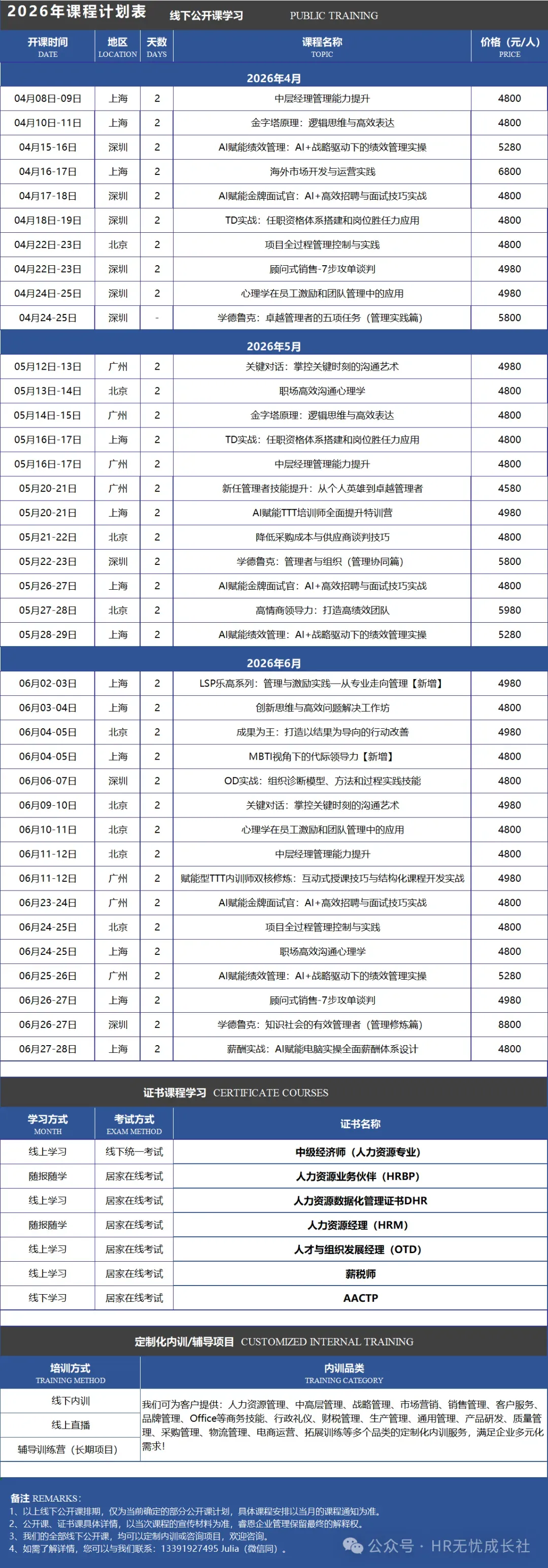 备注:企业内训定制课、线下管理公开课、人社系证书课程、经营管理HRD知识库资料终身会员|(企业集采、团购、企业会员服务优惠政策),可添加微信:z15204116985 hr无忧成长社(请备注事由)