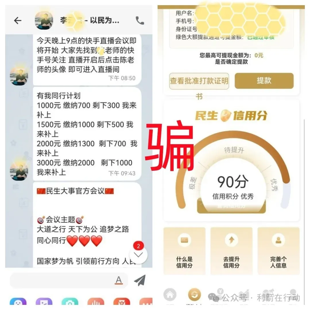 民生大事APP是打着“国家项目”旗号的民族资产解冻类诈骗,骗子在直播间忽悠那些想贪图骗子高额回报的人,谎称要打款了,还给股权,目的是让参与者“捐款”,而收款人全是来路不明的个人账户。为了让一些犹豫不定的观望者快速交钱,11日晚上骗子谎称“所有还没有使用绿色通道提款 还没有修复信用分到100分的家人们 请注意距离4月21日打款 仅仅只剩下10天的时间..........”,还采用了一招虚假“垫支”诈骗手段,谎称本该交1000元钱的,只交700元,其余300元由平台来出,交1500元的,只交1000元,其余500元平台来出..........