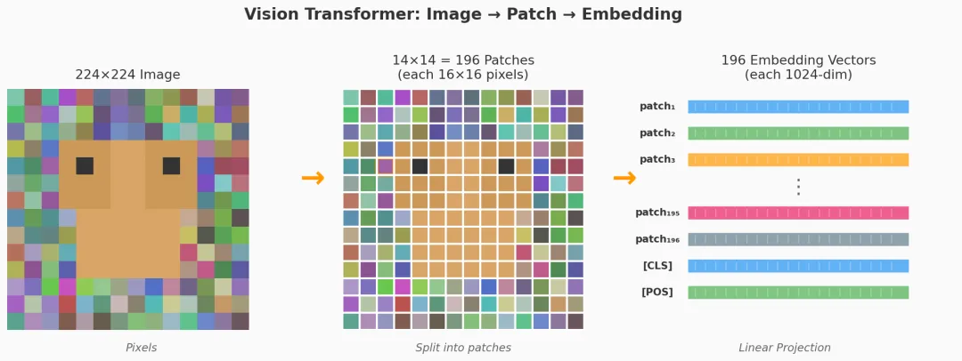 就像文本被切成 token 一样,图像也可以被切成 patch。然后用 Transformer 处理这些 patch——和处理文本用的是同一套架构。