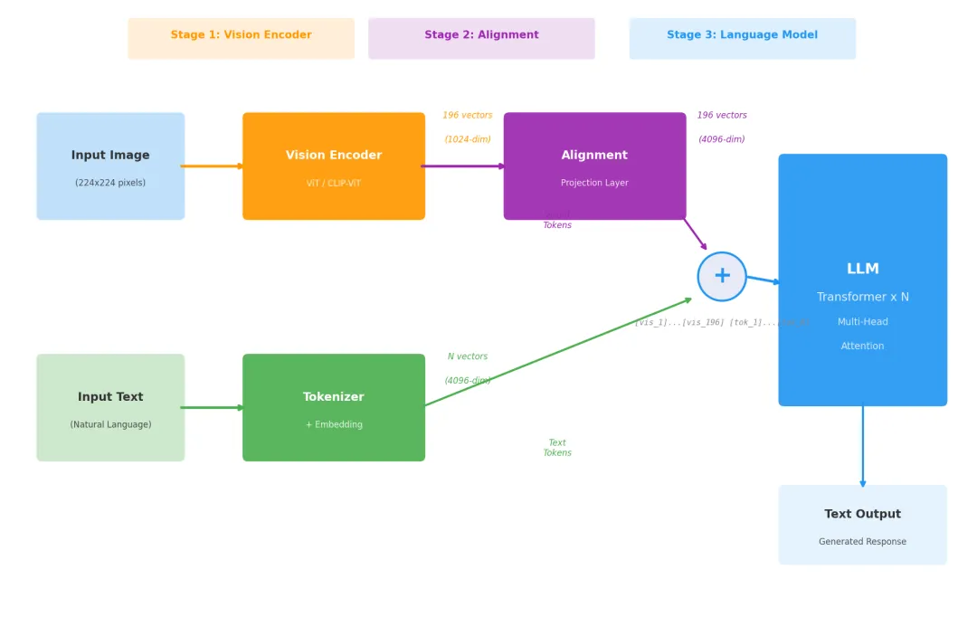 本文讲的是 LLaVA 式的"拼接"架构——先分别训好视觉编码器和 LLM,再用对齐层把它们"接"起来。这是开源界最主流、最清晰的方案。