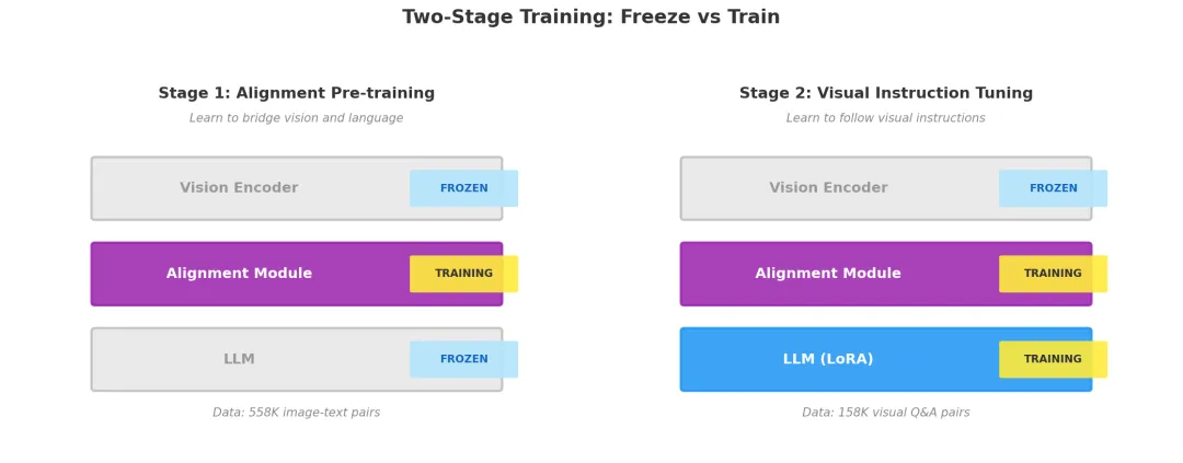 分别训好视觉编码器和 LLM → 用对齐层"接线"