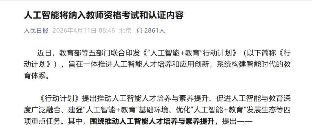 今天看到人民日报公众号发布的文章,谈到教育部等五部门印发《“人工智能 + 教育” 行动计划》,要全面推动AI进入基础教育、高等教育。