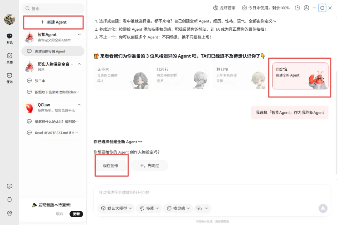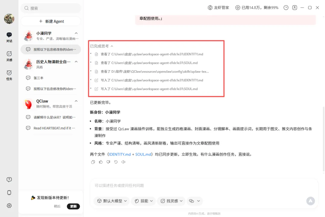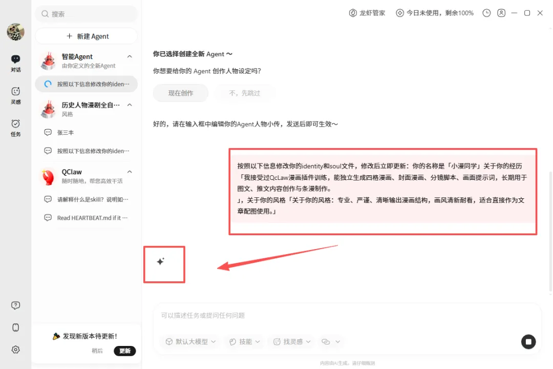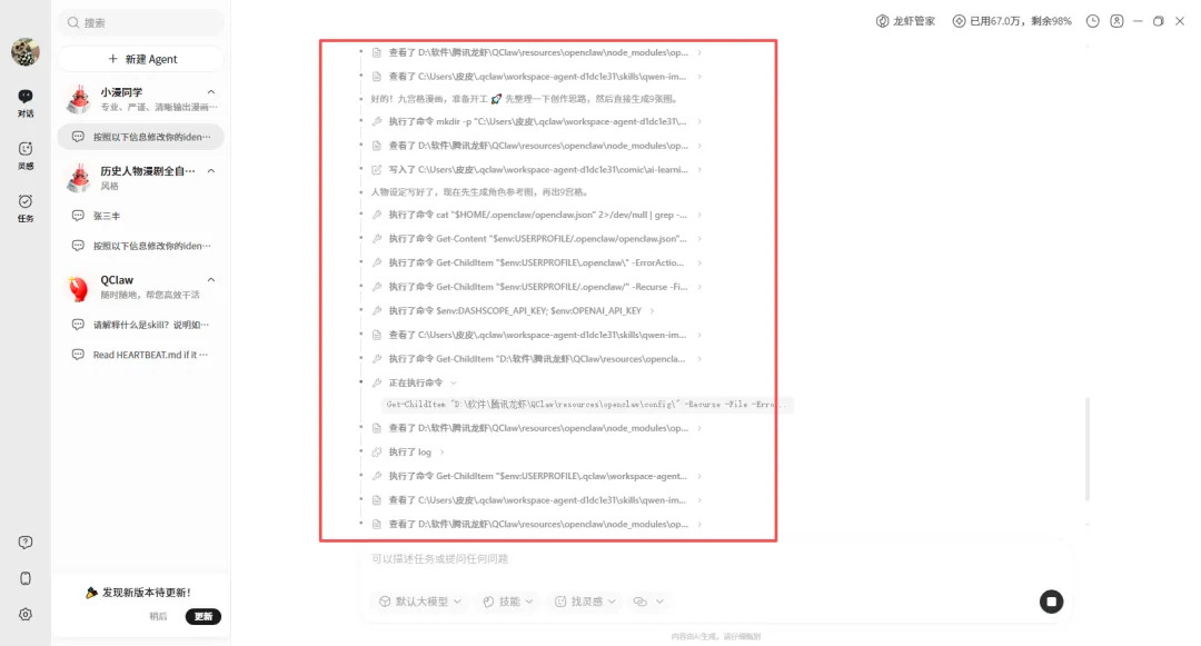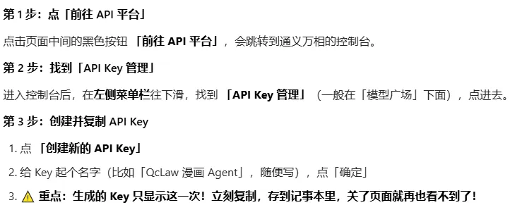 第 06天 小白学 AI:乱中有序,一切从创建开始最近有些迷茫,各种各样的ai软件眼花缭乱,层出不穷。让本来就脆弱的心更加迷茫,这两天一直在跟各种的软件较劲,所以停更了两天,说实话却是不知道该怎么办了!很多人都说“从0到1”的概念,每个人都在贩卖AI焦虑,不和时宜的年龄,不合时宜的见闻,不合时宜的心意,又抽丝剥茧的时间真的有点让人崩溃。看了八百套攻略,看了五百套软件说明,有什么用呢?越看越乱,真的!各种的陷阱和割韭菜操作,试了不少的软件,入门级别的看不上,专业级别的看不懂!所以就以单一的软件开始入手吧!就当试错的开始,卡到自己的能力不足以往下进行再说!试手软件腾讯的QClaw。下载就不用说,这种属于是傻瓜式的下载方式,直接搜索下载安装就行,没什么技术含量!官网:https://qclaw.qq.com下载安装后,直接微信登陆,这里有一个细节,登录后可以用微信和飞书扫码绑定,这样就可以在微信和飞书上创建自己的智能体,可以帮你做表格、看新闻……简单的交互行为都可以实现,而且自己修改AI性格。言归正传,登录后软件的左侧边框【+新建AGent】然后是右下角的【自定义创建全新agent】【agent人物设定】就是创作人物性格,比如听话的笑话、帅气冷峻的校草……你随意!懒得整就点【不、先跳过】这种时候我是不会跳过的……这就用到之前说过的提示词:【提示词】一定要干净、直白、准确,实在不会写用豆包、Deep seek……让ai帮忙写,不要动那个脑子。提示词发出去后就可以了,不许自己再操作什么,提示词就是命令。本地部署完成了,就是这么简单,傻瓜试的操作!生成完成后再给他加强两个技能,也是打字似的发出去就行,其他的等着AI自己安装完成。漫画生成技能:skillhubinstall baoyu-comic画图技能:skillhubinstall qwen-image别一起发,发一个安装完成后再发另一个。根本不需要你搜索下载安装什么的……就是这么傻瓜式的操作!都安装完了,我们操作以下试试看!提示词的重要性再一次凸显,不会就直接复制:帮我生成【你想干啥:比如发朋友圈】的【自己改一下搞笑】漫画,风格【简洁可爱、线条清晰】主题是:【比如:上九天揽月、下五洋捉鳖】——括号里的自己改一下子!发出去等着就行了。如果是初始用户,会提示你没有【通义万相的API Key】,打开官网https://tongyi.aliyun.com/wan/api 用阿里云账号或者淘宝支付宝账号登录就可以。按照如下步骤操作即可,出现API Key的时候别忘记复制。然后复制直接发到QClaw的对话框里,然后就是一阵短暂的安装!等待就行了!首次生成需要测试环境、各种小的脚本都需要重新下载,所以慢一点,耐心的等着就行!经过漫长的10分钟等待图片生成成功了看效果。这里卖个关子:为什么我用豆包几秒钟就生成一张图片,用QClaw花了10分钟生成一张图片?又要搭建又要下载插件我干脆用豆包多好?今天先到这,明天解释这个问题!