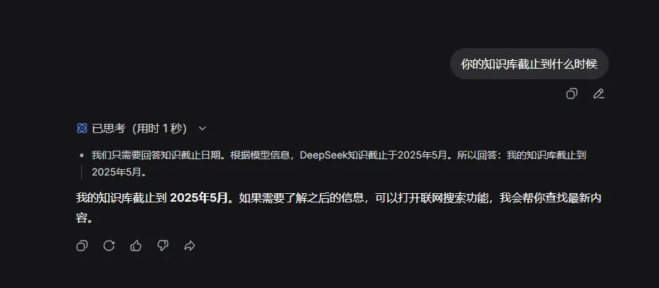 接下来是联网搜索,名称很直白,我只讲为什么会需要它。大多数人不知道的是,AI的知识库是有截止日期的。AI是靠数据喂出来的,数据什么时候喂的?训练的时候。训练一结束,就不再喂新数据了。我们以DeepSeek举例,它的知识库截止到2025年5月。当然,DeepSeek本身不知道自己的截止日期,毕竟知识真的截止到某个日期,那AI应该连“我到期了”这件事本身都不知道。它是通过查阅网上公开资料和出厂时开发者加的告知知道的,当然这是另外一回事了。所以截止日期之后发生的事情,它是真的不知道。这时候就需要联网搜索了——它会去网上找公开资料,自己读、自己总结。当然,我们自己上网都要鉴别真假,AI也一样。前段时间315曝光的GEO投毒,就是有人故意发布虚假数据迷惑AI,让AI信以为真、帮着打广告。所以,联网搜索是帮你省了搜索时间,但没帮你省辨别真伪的责任。