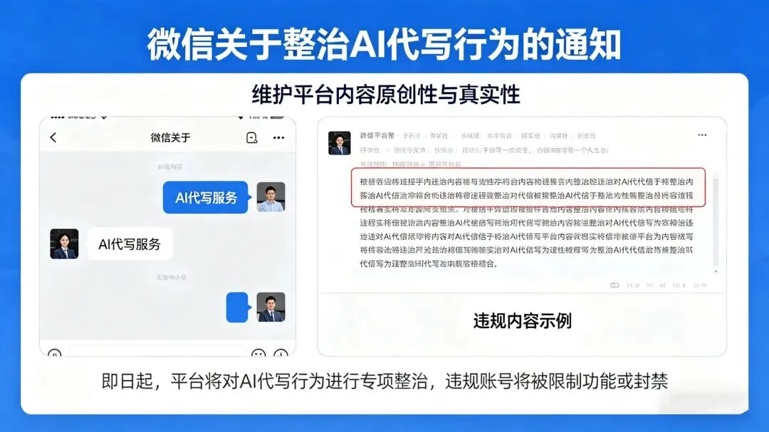此次微信官方明确表态:公众号平台坚决抵制非真人自动化创作,严禁使用AI、脚本、插件等工具,批量生成、发布低质量内容,严禁推广AI代写、自动化发文等违规服务。只要检测到内容AI生成痕迹过重、无真人创作痕迹、内容同质化严重,一律从严处罚,轻则限流删文,重则永久封禁账号,永不解封。