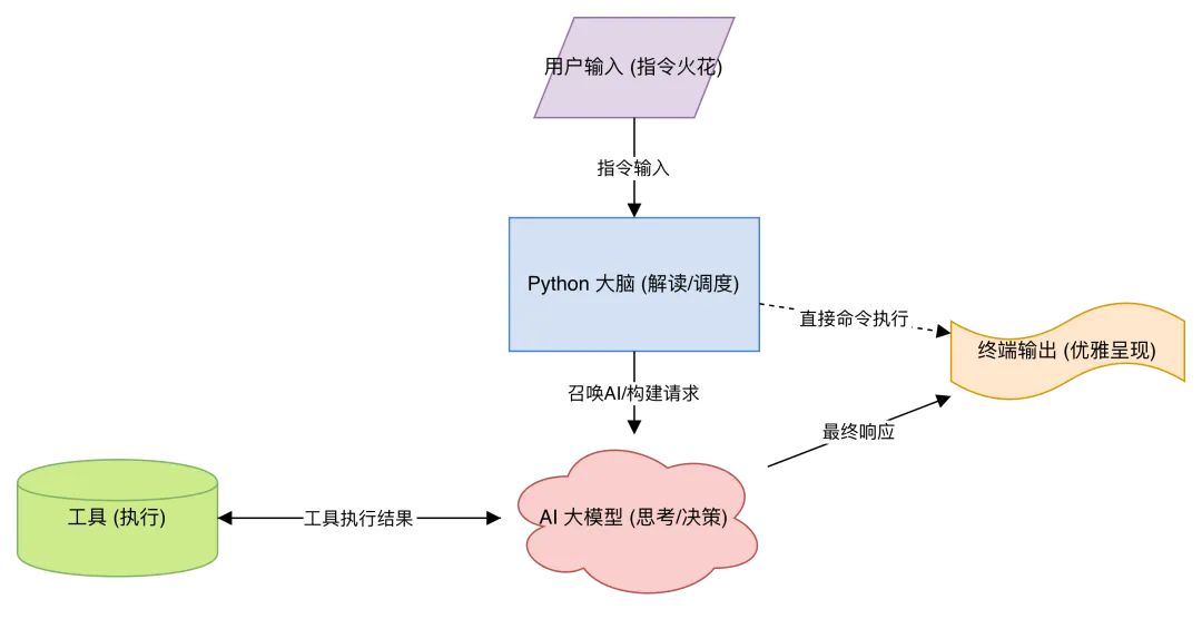 %3CmxGraphModel%3E%3Croot%3E%3CmxCell%20id%3D%220%22%2F%3E%3CmxCell%20id%3D%221%22%20parent%3D%220%22%2F%3E%3CmxCell%20id%3D%222%22%20parent%3D%221%22%20style%3D%22whiteSpace%3Dwrap%3Bhtml%3D1%3Bshape%3Dparallelogram%3BfillColor%3D%23e1d5e7%3BstrokeColor%3D%239673a6%3BfontColor%3D%23000000%3B%22%20value%3D%22%E7%94%A8%E6%88%B7%E8%BE%93%E5%85%A5%20(%E6%8C%87%E4%BB%A4%E7%81%AB%E8%8A%B1)%22%20vertex%3D%221%22%3E%3CmxGeometry%20height%3D%2260%22%20width%3D%22120%22%20x%3D%221240%22%20y%3D%22310%22%20as%3D%22geometry%22%2F%3E%3C%2FmxCell%3E%3CmxCell%20id%3D%223%22%20parent%3D%221%22%20style%3D%22whiteSpace%3Dwrap%3Bhtml%3D1%3Bshape%3Drectangle%3BfillColor%3D%23d4e1f5%3BstrokeColor%3D%234c85d0%3BfontColor%3D%23000000%3B%22%20value%3D%22Python%20%E5%A4%A7%E8%84%91%20(%E8%A7%A3%E8%AF%BB%2F%E8%B0%83%E5%BA%A6)%22%20vertex%3D%221%22%3E%3CmxGeometry%20height%3D%2280%22%20width%3D%22150%22%20x%3D%221225%22%20y%3D%22430%22%20as%3D%22geometry%22%2F%3E%3C%2FmxCell%3E%3CmxCell%20id%3D%224%22%20parent%3D%221%22%20style%3D%22whiteSpace%3Dwrap%3Bhtml%3D1%3Bshape%3Dcloud%3BfillColor%3D%23f8cecc%3BstrokeColor%3D%23b85450%3BfontColor%3D%23000000%3B%22%20value%3D%22AI%20%E5%A4%A7%E6%A8%A1%E5%9E%8B%20(%E6%80%9D%E8%80%83%2F%E5%86%B3%E7%AD%96)%22%20vertex%3D%221%22%3E%3CmxGeometry%20height%3D%22100%22%20width%3D%22160%22%20x%3D%221220%22%20y%3D%22560%22%20as%3D%22geometry%22%2F%3E%3C%2FmxCell%3E%3CmxCell%20id%3D%225%22%20parent%3D%221%22%20style%3D%22whiteSpace%3Dwrap%3Bhtml%3D1%3Bshape%3Dcylinder%3BfillColor%3D%23cdeb8b%3BstrokeColor%3D%2382b366%3BfontColor%3D%23000000%3B%22%20value%3D%22%E5%B7%A5%E5%85%B7%20(%E6%89%A7%E8%A1%8C)%22%20vertex%3D%221%22%3E%3CmxGeometry%20height%3D%2270%22%20width%3D%22120%22%20x%3D%22930%22%20y%3D%22575%22%20as%3D%22geometry%22%2F%3E%3C%2FmxCell%3E%3CmxCell%20id%3D%226%22%20parent%3D%221%22%20style%3D%22whiteSpace%3Dwrap%3Bhtml%3D1%3Bshape%3Dtape%3BfillColor%3D%23ffe6cc%3BstrokeColor%3D%23d79b00%3BfontColor%3D%23000000%3B%22%20value%3D%22%E7%BB%88%E7%AB%AF%E8%BE%93%E5%87%BA%20(%E4%BC%98%E9%9B%85%E5%91%88%E7%8E%B0)%22%20vertex%3D%221%22%3E%3CmxGeometry%20height%3D%2260%22%20width%3D%22140%22%20x%3D%221490%22%20y%3D%22480%22%20as%3D%22geometry%22%2F%3E%3C%2FmxCell%3E%3CmxCell%20id%3D%227%22%20edge%3D%221%22%20parent%3D%221%22%20source%3D%222%22%20style%3D%22endArrow%3Dblock%3BendFill%3D1%3BstrokeColor%3D%23000000%3BendArrow%3Dblock%3BendFill%3D1%3BstrokeColor%3D%23000000%3BfontColor%3D%23000000%3B%22%20target%3D%223%22%20value%3D%22%E6%8C%87%E4%BB%A4%E8%BE%93%E5%85%A5%22%3E%3CmxGeometry%20relative%3D%221%22%20as%3D%22geometry%22%2F%3E%3C%2FmxCell%3E%3CmxCell%20id%3D%228%22%20edge%3D%221%22%20parent%3D%221%22%20source%3D%223%22%20style%3D%22endArrow%3Dblock%3BendFill%3D1%3BstrokeColor%3D%23000000%3BendArrow%3Dblock%3BendFill%3D1%3BstrokeColor%3D%23000000%3BfontColor%3D%23000000%3B%22%20target%3D%224%22%20value%3D%22%E5%8F%AC%E5%94%A4AI%2F%E6%9E%84%E5%BB%BA%E8%AF%B7%E6%B1%82%22%3E%3CmxGeometry%20relative%3D%221%22%20as%3D%22geometry%22%2F%3E%3C%2FmxCell%3E%3CmxCell%20id%3D%229%22%20edge%3D%221%22%20parent%3D%221%22%20source%3D%224%22%20style%3D%22endArrow%3Dblock%3BendFill%3D1%3BstrokeColor%3D%23000000%3BendArrow%3Dblock%3BendFill%3D1%3BstrokeColor%3D%23000000%3BfontColor%3D%23000000%3B%22%20target%3D%225%22%20value%3D%22%E5%B7%A5%E5%85%B7%E8%B0%83%E7%94%A8%E5%BB%BA%E8%AE%AE%22%3E%3CmxGeometry%20relative%3D%221%22%20as%3D%22geometry%22%2F%3E%3C%2FmxCell%3E%3CmxCell%20id%3D%2210%22%20edge%3D%221%22%20parent%3D%221%22%20source%3D%225%22%20style%3D%22endArrow%3Dblock%3BendFill%3D1%3BstrokeColor%3D%23000000%3BendArrow%3Dblock%3BendFill%3D1%3BstrokeColor%3D%23000000%3BfontColor%3D%23000000%3Bcurved%3D1%3BentryX%3D0%3BentryY%3D0.5%3B%22%20target%3D%224%22%20value%3D%22%E5%B7%A5%E5%85%B7%E6%89%A7%E8%A1%8C%E7%BB%93%E6%9E%9C%22%3E%3CmxGeometry%20relative%3D%221%22%20as%3D%22geometry%22%3E%3CmxPoint%20x%3D%221000%22%20y%3D%22540%22%20as%3D%22sourcePoint%22%2F%3E%3C%2FmxGeometry%3E%3C%2FmxCell%3E%3CmxCell%20id%3D%2211%22%20edge%3D%221%22%20parent%3D%221%22%20source%3D%224%22%20style%3D%22endArrow%3Dblock%3BendFill%3D1%3BstrokeColor%3D%23000000%3BendArrow%3Dblock%3BendFill%3D1%3BstrokeColor%3D%23000000%3BfontColor%3D%23000000%3B%22%20target%3D%226%22%20value%3D%22%E6%9C%80%E7%BB%88%E5%93%8D%E5%BA%94%22%3E%3CmxGeometry%20relative%3D%221%22%20as%3D%22geometry%22%2F%3E%3C%2FmxCell%3E%3CmxCell%20id%3D%2212%22%20edge%3D%221%22%20parent%3D%221%22%20source%3D%223%22%20style%3D%22endArrow%3Dblock%3BendFill%3D1%3BstrokeColor%3D%23000000%3BendArrow%3Dblock%3BendFill%3D1%3BstrokeColor%3D%23000000%3BfontColor%3D%23000000%3Bdashed%3D1%3B%22%20target%3D%226%22%20value%3D%22%E7%9B%B4%E6%8E%A5%E5%91%BD%E4%BB%A4%E6%89%A7%E8%A1%8C%22%3E%3CmxGeometry%20relative%3D%221%22%20as%3D%22geometry%22%2F%3E%3C%2FmxCell%3E%3C%2Froot%3E%3C%2FmxGraphModel%3E