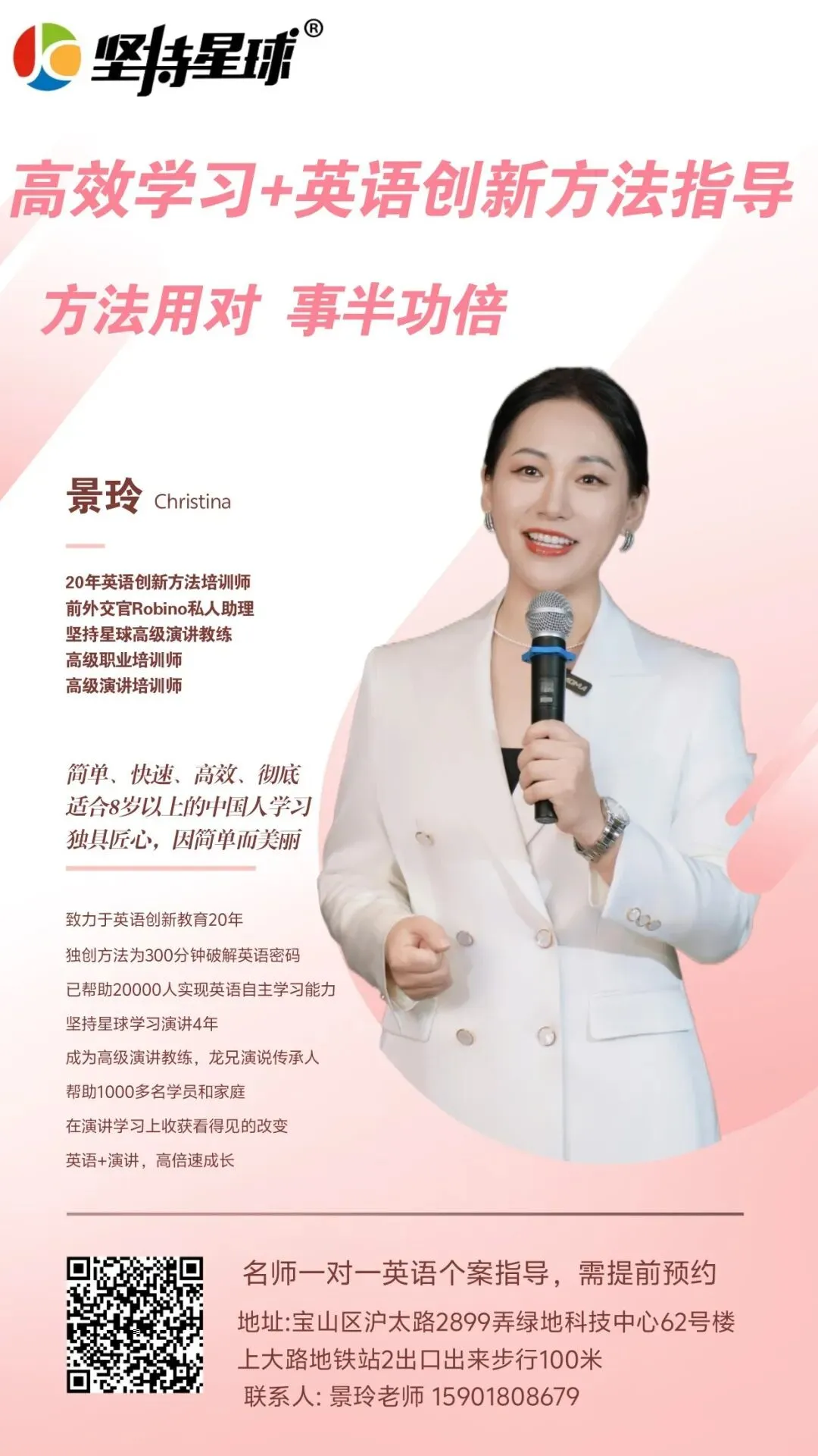 景玲老师拥有20年英语方法指导教学经验,曾和导师前国家外交官Robino一起,研究中国人如何快速高效学习英语,独创了一套简单、快速、高效的英语速成方案; 过去20年成功指导成人学员达20000多名,中小学生5000多名。