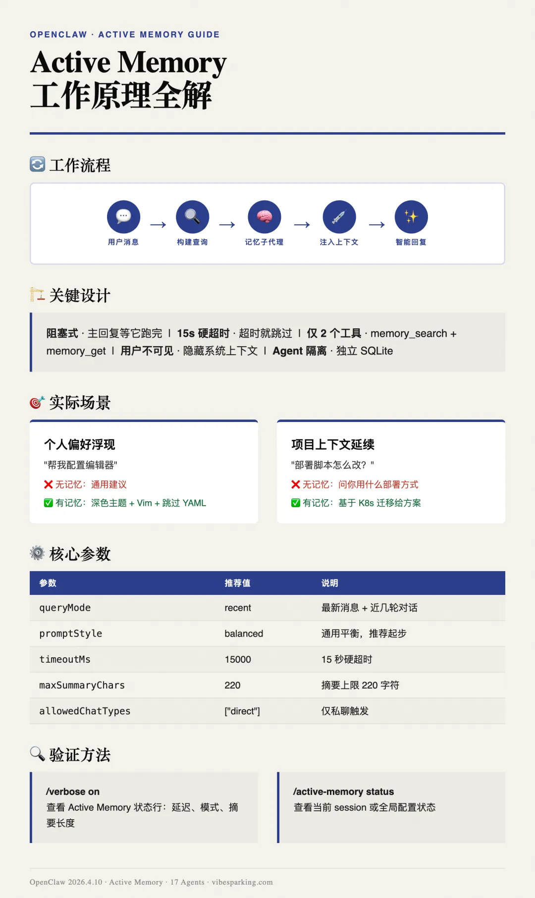{"active-memory":{"enabled":true,"config":{"enabled":true,"agents":["vs","vs-apexdata","vs-dev","vs-ops-mgr","vs-park-service","vs-po","vs-qa","vs-yude","careinner-all","claude","main","test","vibesparking","vs-claude","vs-openclaw-mgr","vs-sites-astro","vs-wechat"],"allowedChatTypes":["direct"],"modelFallbackPolicy":"default-remote","queryMode":"recent","promptStyle":"balanced","timeoutMs":15000,"maxSummaryChars":220,"persistTranscripts":false,"logging":true}}}配置要点