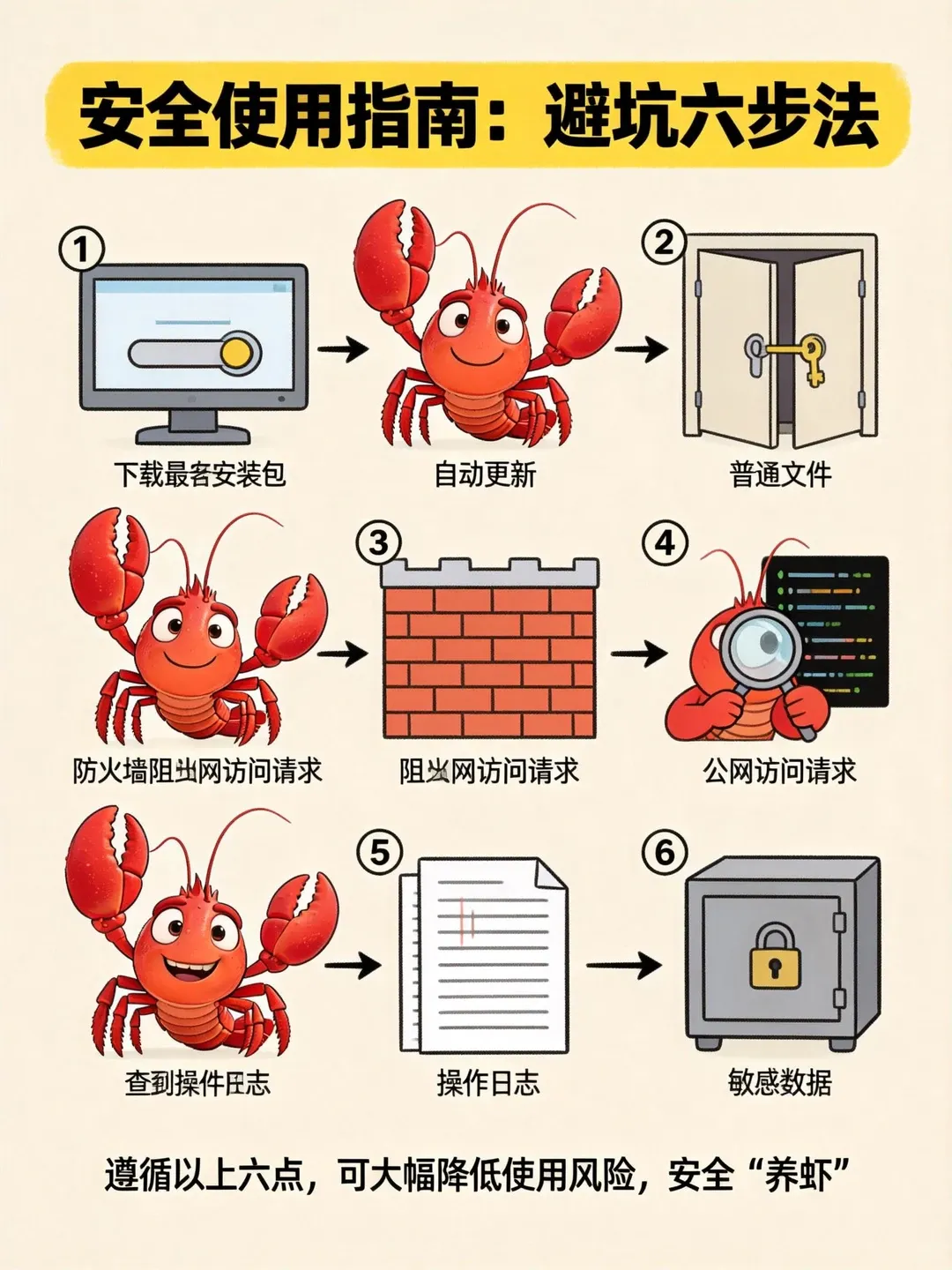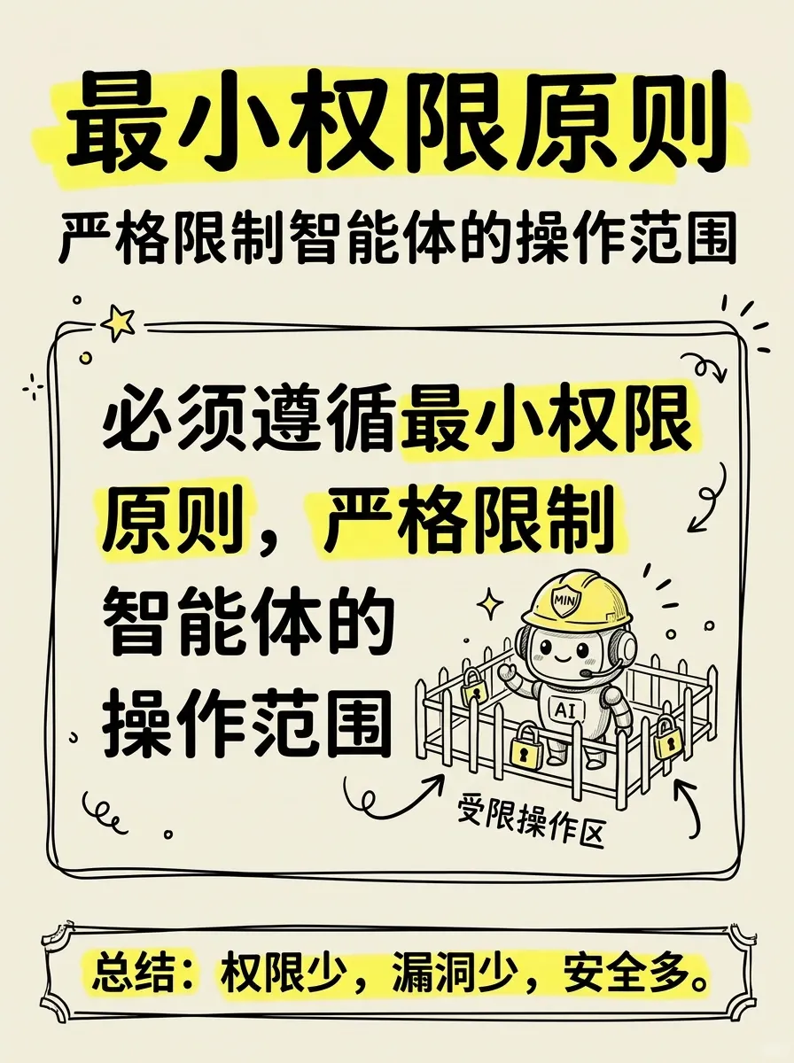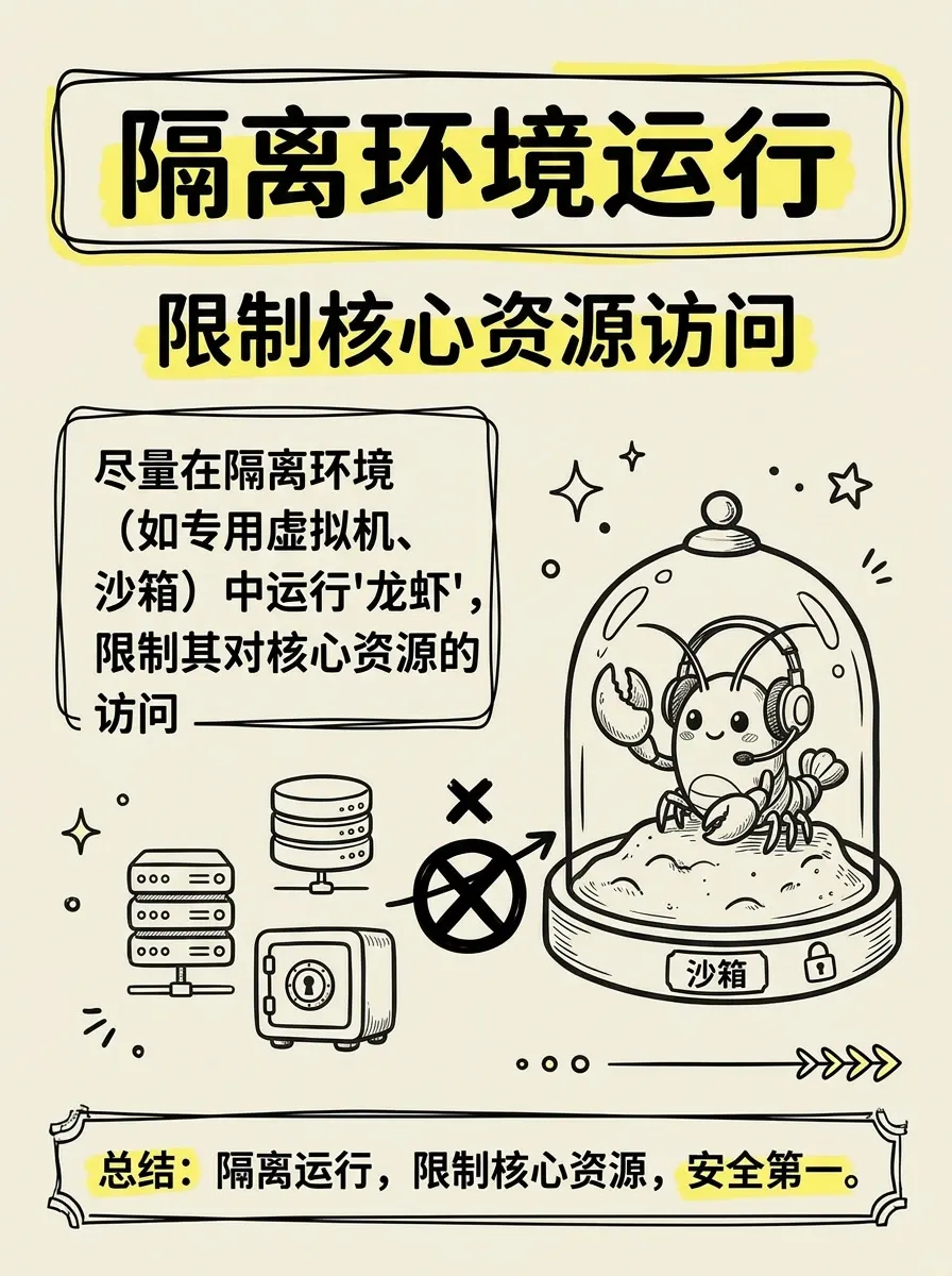 部署要求:使用官方最新稳定版本,从官方渠道下载,开启自动更新提醒。严格控制互联网暴露面,避免将AI智能体实例暴露到公网。初期使用虚拟机或沙箱运行,避免在生产环境直接部署。