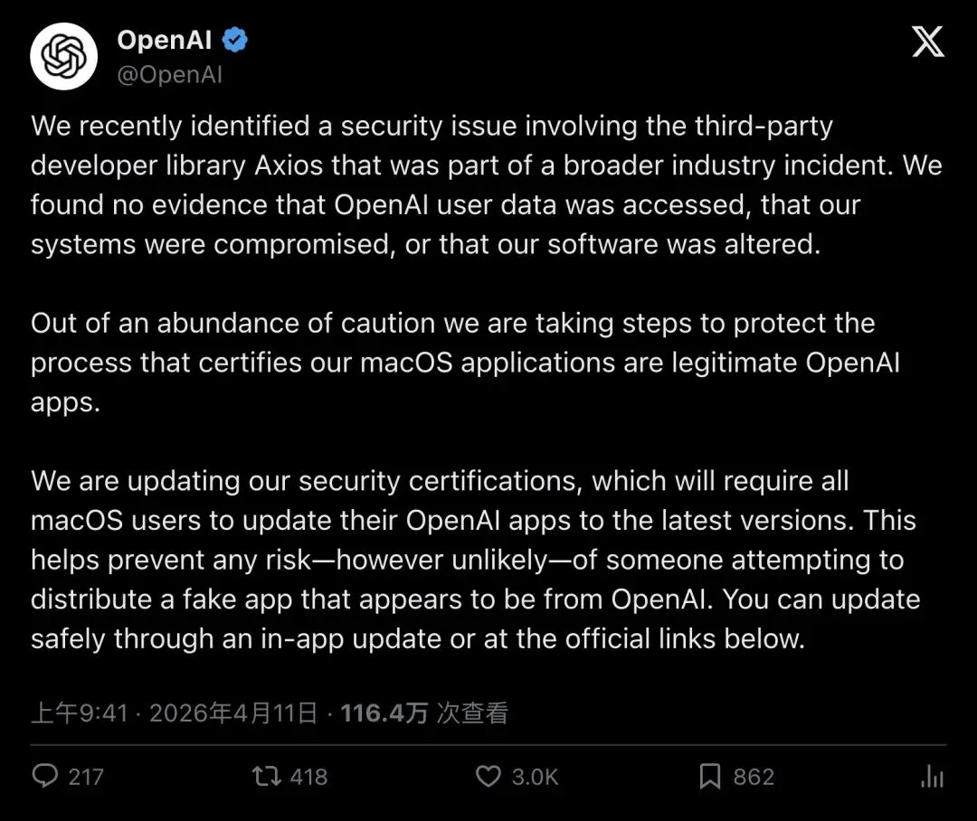 3)OpenAI 为何强调“没证据”同时又要求 macOS 用户立刻更新