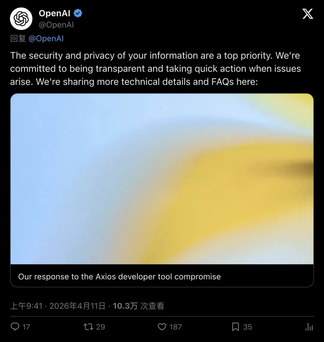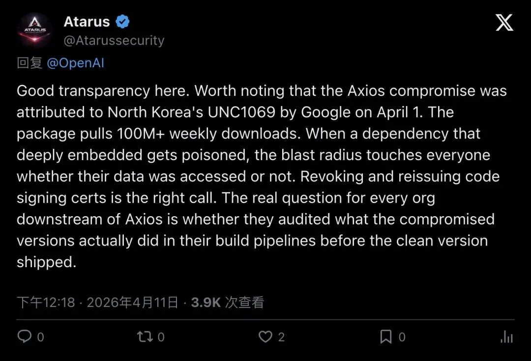 OpenAI(X):https://x.com/OpenAI/status/2042780052669239782 OpenAI(技术说明/FAQ):https://openai.com/index/axios-developer-tool-compromise/ Google Threat Intelligence Group(GTIG):https://cloud.google.com/blog/topics/threat-intelligence/north-korea-threat-actor-targets-axios-npm-package npm axios 页面:https://www.npmjs.com/package/axios