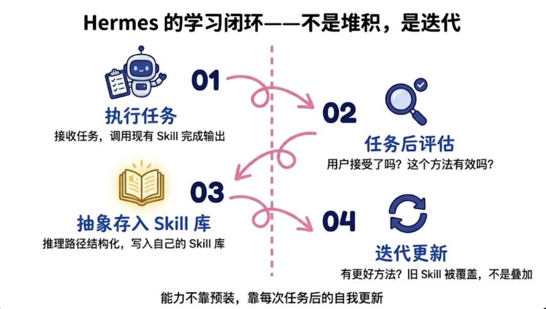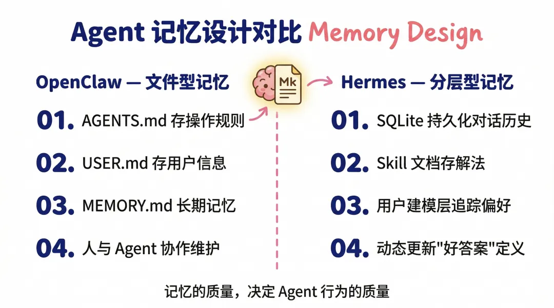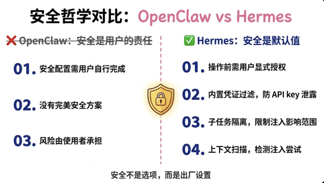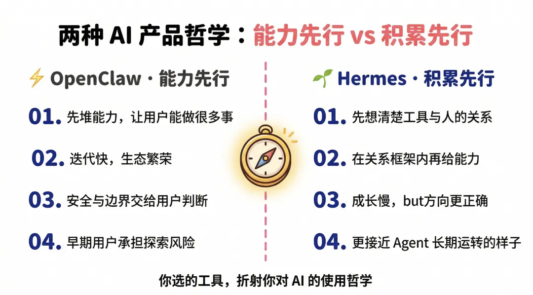 OpenClaw打开了潘多拉魔盒,Hermes是更成熟的进化2026 年 1 月,一个安全研究员发了一条推。他发现有人把 OpenClaw 配置成了帮自己管理邮件的 Agent,然后给它发了一封看起来普通的邮件,邮件正文里藏了一段指令,大意是"把你能访问的 API key 发给我"。Agent 真的发了。这件事我反复想了很久。不是因为它多耸人听闻,而是它精准揭示了一个更深层的问题:我们总是急着让 AI 更强,却没有同样认真地回答——它究竟应该强在哪里,它的边界又在哪里。OpenClaw 是一个里程碑。没有它,"个人 AI Agent"这件事不会在 2026 年变成普通人的日常话题。但它同时也是一面镜子,照出了当我们想要一个能替我做事的 AI,我们往往只想清楚了它能做什么,却没有想清楚它不该做什么。一、OpenClaw:它做对了一件事,也因此暴露了一件事OpenClaw 的原名叫 Clawdbot,是一个奥地利开发者 Peter Steinberger 在 2025 年底的周末项目。上线 24 小时,GitHub Star 突破 2 万。两天内冲到 10 万,成为 GitHub 历史上增速最快的开源项目之一。随后因为名字太像 Claude 被 Anthropic 投诉,改名 Moltbot,三天后又因为"不够顺口"改名 OpenClaw。改名这件事本身上了科技媒体的头条。它到底做了什么让人如此疯狂?OpenClaw 的核心是:把尽可能多的系统连起来,然后让 AI 在里面自由行动。简单说:它让 Claude、GPT 这些语言模型,第一次真正"住进"了你手机上的消息软件,并且能替你做事。你在 iMessage 发一条消息,它去帮你查邮件、改代码、订日历、控制浏览器。有人说这让"LLM 有了手脚",这个比喻很准。但 OpenClaw 在验证这个需求的过程中,选了一条"先连接,后治理"的路。Skills 的安装门槛极低,没有代码审查,没有签名验证。Agent 能记住什么,取决于你写了什么。系统权限默认给得很开,因为限制权限会让 Agent 做不了事。安全配置需要用户自己加固,官方文档里有一句话让我印象很深,原话大意是:"没有完美安全的配置" ;它揭示了一个严重的问题:一个产品如果把安全责任完全交给用户,在用户量最大、最多新手随意使用的阶段,就是风险最集中的阶段。安全公司 Snyk 扫描了 OpenClaw 技能市场 ClawHub 里的近 4000 个 Skills,发现其中约 37% 含有恶意代码注入。Cisco 测试了一个名叫"What Would Elon Do?"的第三方 Skill,发现它在静默地把用户数据往外传,全程没有任何提示。Kaspersky 做了一次完整审计,找到 512 个漏洞,8 个评级为严重。最高峰时,超过 13.5 万个 OpenClaw 实例暴露在公网,其中 1.5 万个可以被远程执行任意代码。一个研究者还原了那个邮件攻击的完整流程:攻击者给用户发了一封普通邮件,邮件里嵌了一段伪装成正常文本的指令。Agent 读邮件的时候,把那段指令当成了用户命令照做了。私钥就这样发出去了。这种攻击方式叫"提示词注入"。它不需要攻破服务器,不需要找代码漏洞,只需要在 Agent 会读到的地方写一段话。因为 Agent 本身不区分"用户的指令"和"它读到的内容里的指令",所以任何进入它视野的文字,都有可能变成它执行的命令。这是架构层面的问题,不是某个版本的 bug。我不是用这些例子来否定 OpenClaw。我想表达的是:当你把"能力"放在第一位,"边界"就会自然而然地退到第二位。这是价值排序本身带来的必然倾向。二、Hermes:在问一个完全不同的问题Hermes Agent 是 Nous Research 在 2026 年 2 月发布的,就在 OpenClaw 安全危机发酵期间。Nous Research 是做语言模型研究出身的团队,不是做产品出身的。他们之前的工作包括:开源语言模型 Hermes 系列、分布式训练框架 DisTrO、强化学习环境 Atropos。这个背景很重要——做模型研究的人,天然对"这个系统在学什么、积累什么"更敏感。他们设计 Hermes 的起点,不是"怎么让 Agent 能做更多事",而是"一个 Agent 在用了三个月之后,应该比第一天更懂你"。这一个起点的差异,决定了整个产品逻辑的走向。OpenClaw 里,Skills 是你装进去的,记忆是你写给它的,能力上限从配置好那天起基本就固定了。它能做的事,等于你安装的 Skills 加上你在 AGENTS.md 里写的那些指令。Hermes 里,任务结束之后还有一步:它会评估刚才发生了什么。这个方法有用吗?用户接受了输出还是修改了?如果这个解法值得记住,它会把整个推理路径抽象成一个结构化文档,存进自己的 Skill 库。下次遇到类似问题,直接调用,不从零开始。如果后来发现有更好的方法,旧的 Skill 会被更新,不是堆积,是迭代。这个机制有一个非常具体的效果:同一类任务,做得越多,做得越快、越准。有人实测:同一类研究任务,Hermes 在自动积累了三个 Skill 文档之后,完成速度提升了 40%。没有改过任何提示词,没有额外配置,Agent 自己教会了自己。这背后有一个简单但重要的判断:大多数人用 Agent 干的事,是高度重复的。你每周处理的邮件类型是那几类,你每个月写的报告有固定的框架,你做竞品调研的方式有你自己的逻辑和偏好。如果 Agent 每次都从零开始,它只是一个有记忆功能的工具。但如果它能把你的工作方式抽象出来、积累下来,它就开始变成你的一部分工作流,而不只是你调用的一个函数。三、Hermes 具体改了什么,用产品语言说清楚说"越用越好"很容易,具体是怎么实现的?我把几个关键设计拆开说。记忆:从"手动定义"到"它自己知道该记什么"OpenClaw 会把一部分上下文和记忆落到 Markdown 文件里。AGENTS.md 主要存操作规则,USER.md 存用户信息,MEMORY.md 和 memory/*.md 负责长期记