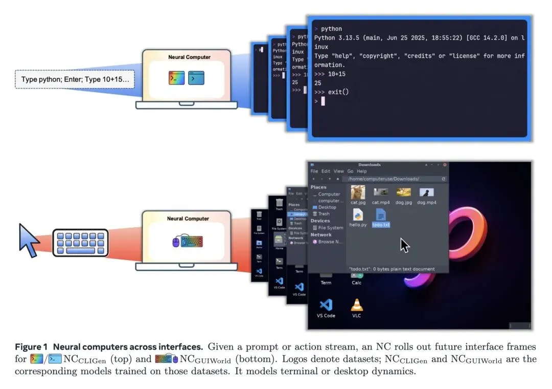 主旨: 本文探讨了是否能用单一的神经网络权重集来充当一台“计算机”。文章提出了“神经计算机(NC)”的概念,旨在通过一个学习到的潜在运行时状态(Latent runtime state)将计算、内存和I/O整合在一起,让大模型本身成为一台可以直接运行指令并输出界面视频的计算机,从而区别于依赖外部软件堆栈的传统计算机或AI Agent。