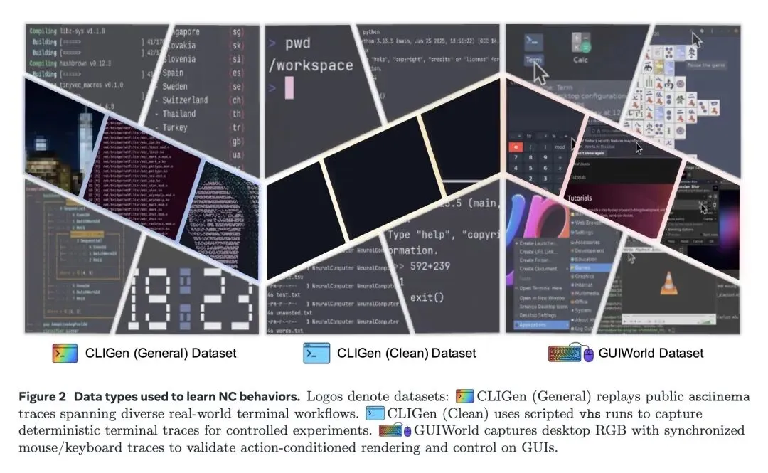 理论贡献:明确界定了NC(神经计算机)和CNC(完全神经计算机)的概念、边界以及评判标准(图灵完备、通用可编程、行为一致性)。 方法贡献:成功构建了针对命令行(CLIGen)和图形界面(GUIWorld)的基于视频的NC原型,并开源了处理文本、动作与视频帧严格时间对齐的数据管道。 实践贡献:通过详尽的消融实验打破了关于视频模型“涌现复杂推理”的迷思,清晰地划定了当前视频大模型在交互环境中的能力边界(擅长渲染和I/O对齐,极度缺乏原生符号计算能力)。