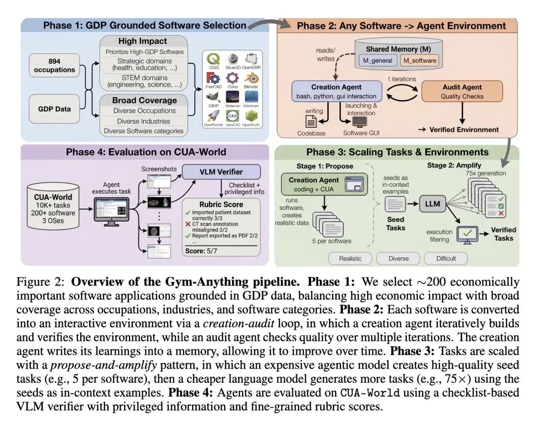 一句话总结:本文提出了 Gym-Anything 框架,通过首创的多智能体“创建-审计”博弈机制将任意软件自动化为交互式环境,构建了以美国 GDP 数据为导向的真实商业价值基准 CUA-World;研究反直觉地发现最强的大模型未必能蒸馏出最好的学生模型,且引入独立的“审计机制”能显著提升长视野任务的成功率,为通向具有真实经济生产力的计算机智能体铺平了道路。