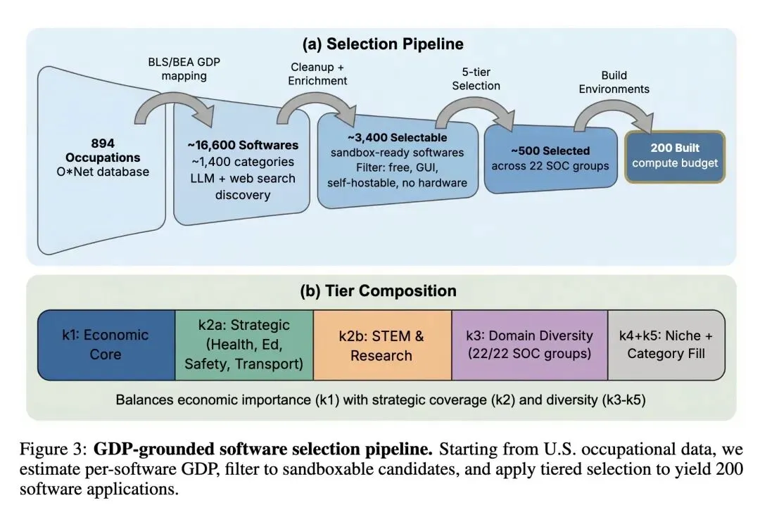多智能体环境构建机制:首创“创建-审计”对抗循环,利用代码智能体编写环境配置脚本,并由审计智能体根据截图和日志进行质量把控,解决了人工配置环境成本过高的问题。 提出-放大 (Propose-and-Amplify) 任务生成范式:昂贵的智能体通过实际操作生成少量高质量的“种子任务”,廉价的语言模型再以此为上下文批量放大生成海量多样化任务。 基于特权信息的 VLM 验证机制:摒弃了脆弱的硬编码代码验证,利用环境脚本中自带的“特权信息”(Ground Truth)生成评分清单,并通过 VLM 结合“作弊检测(Integrity Check)”对智能体轨迹进行精准的步骤级评分。 基于 GDP 贡献度的软件筛选方法:首次将 O*NET 职业经济数据与软件挂钩,以此决定构建哪些软件环境,确保基准测试具有真实的宏观经济价值。