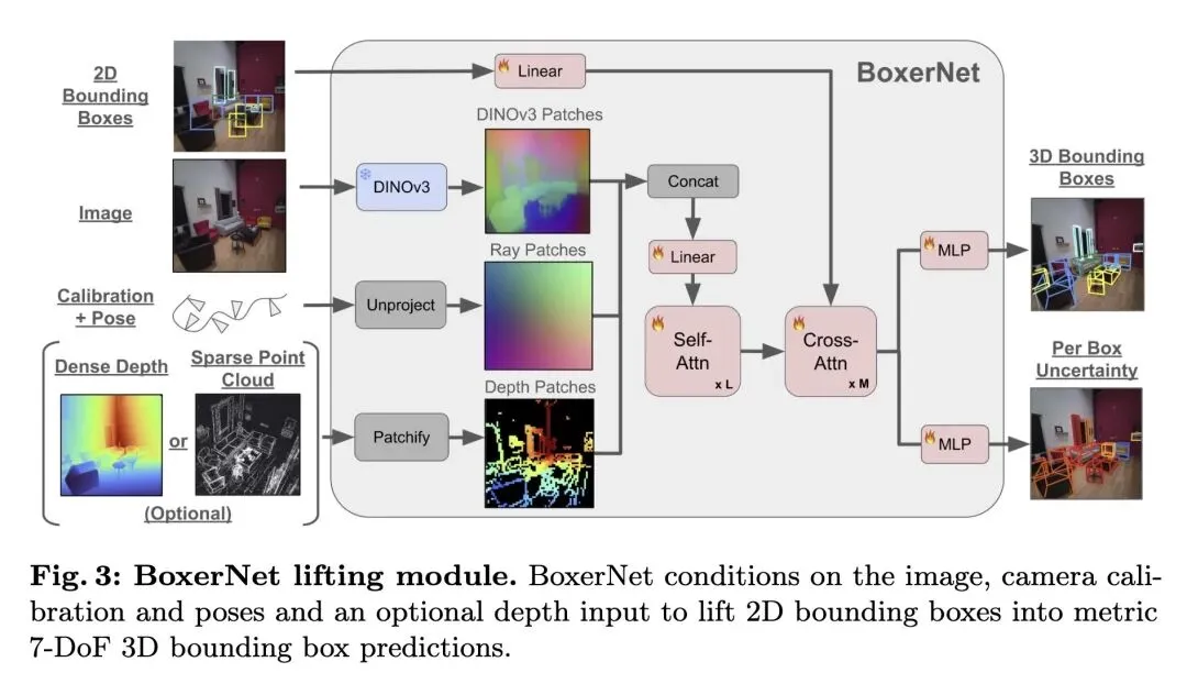 通过将2D开放世界检测(语义)与3D度量提升(几何)解耦,利用网络级规模的2D视觉语言模型,巧妙绕过了3D标注数据极度匮乏的瓶颈。 提出了 Boxer 框架,能够从2D候选框、带位姿的图像以及可选的深度提示中,估计全局的、静态的7自由度(7-DoF)3D边界框。 关于深度表示的高信息熵创新:用极其简单的“中值深度图块编码(Median depth patch encoding)”取代了复杂的稠密深度网络。这一优雅的设计使 BoxerNet 实现了模态无关性,既能完美处理稠密深度图(RGB-D),也能无缝处理极度稀疏的点云(SLAM/SfM)。 反直觉的数据增强策略:在训练时,如果简单地将3D真实框投影到2D平面,会因为遮挡产生非常松散且不准确的2D框。Boxer 创新性地使用 SAM(Segment Anything)对这些投影框进行“收紧”,使得训练数据与推理时真实的2D检测器行为完美对齐。 关于置信度排序的高信息熵发现:为3D预测引入了任意偶然不确定性(Aleatoric uncertainty)头。将该3D不确定性得分与上游2D检测器的置信度得分取平均,相比于单独使用任何一个得分,能大幅提升候选框的排序质量和最终的 mAP。 在一个包含122万个独立3DBB的超大规模混合数据集上进行训练,涵盖了各种相机模型(针孔、鱼眼)和设备(Project Aria, Quest, iPad, Kinect)。 性能以压倒性优势超越了 CuTR 等 SOTA 方法,特别是在仅有稀疏深度的第一人称视角数据集上(如在 NymeriaPlus 上 mAP 为 0.532 对比 0.010),在稠密深度数据集 CA-1M 上也取得了显著提升(0.412 对比 0.250)。 包含一个多视角时序融合模块,能够对单帧检测结果进行聚类,巧妙解决长方体的90度旋转对称性歧义,并通过 3D NMS 构建全局一致的场景表示。