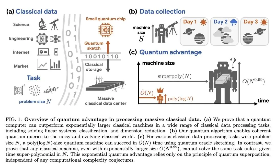 主旨: 本文旨在解决量子机器学习在处理海量经典数据时面临的“数据加载(QRAM)”和“结果读取”两大根本性瓶颈。通过提出量子预言机略图算法,文章证明了即使在没有指数级庞大内存的情况下,拥有几十个逻辑比特的小型量子计算机也能在流式处理经典数据(如线性系统求解、分类、降维)时,展现出经典计算机无法匹敌的指数级空间(内存)优势。