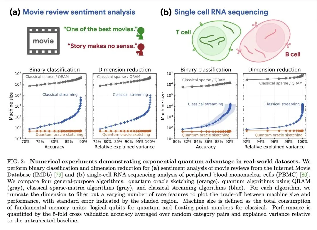 内存消耗(空间复杂度):在执行支持向量机(SVM)和主成分分析(PCA)等任务时,将经典流式算法或稀疏矩阵算法所需的线性或多项式级内存,指数级压缩至多项式对数级 。 实际应用规模:在 IMDb 和 PBMC 数据集实验中,相比于经典算法,机器规模(浮点数/量子比特数)实现了 4 到 6 个数量级(倍)的缩减。