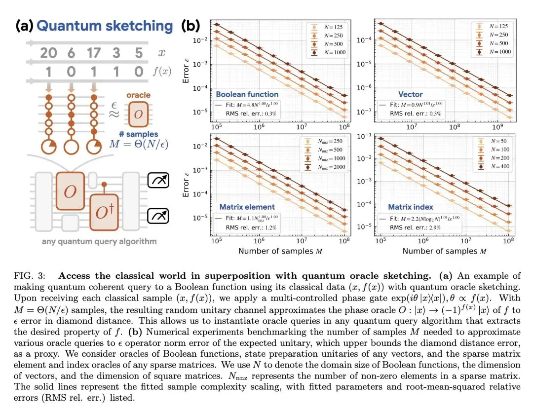 量子预言机略图 (Quantum Oracle Sketching):放弃了将整个数据集存储在 QRAM 中的传统思路,改为接收到经典数据样本时即时施加微小的量子旋转操作,用后即焚,通过累积相干性构建量子预言机。 干扰测量经典影子 (Interferometric Classical Shadows):结合阿达马测试(Hadamard test)与经典影子层析成像技术,创新性地解决了高效读取包含关键“符号(正负)结构”信息的难题,从而生成紧凑的经典机器学习预测模型。 动态去随机化与学习XOR引理:在证明经典算法下限时,开发了一种新的去随机化技术和学习XOR引理,证明了经典算法在内存受限时不仅无法完成任务,而且在面对动态演化的数据时需要超多项式级的样本量。