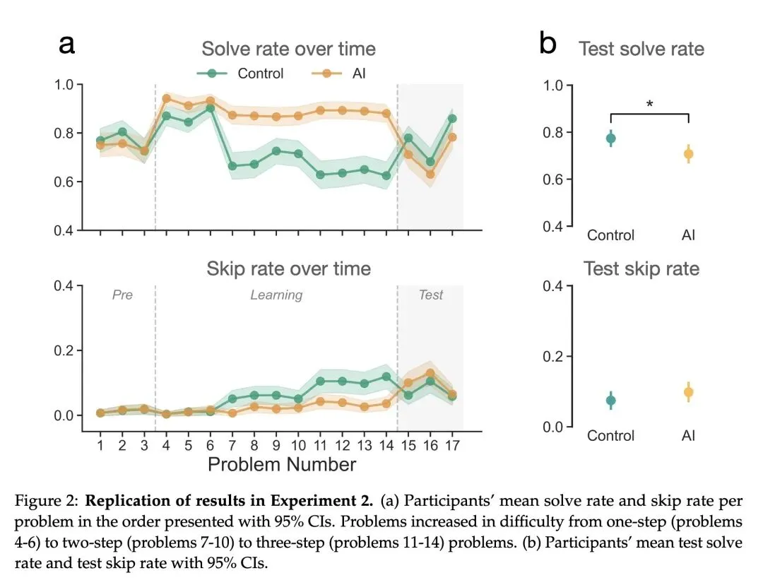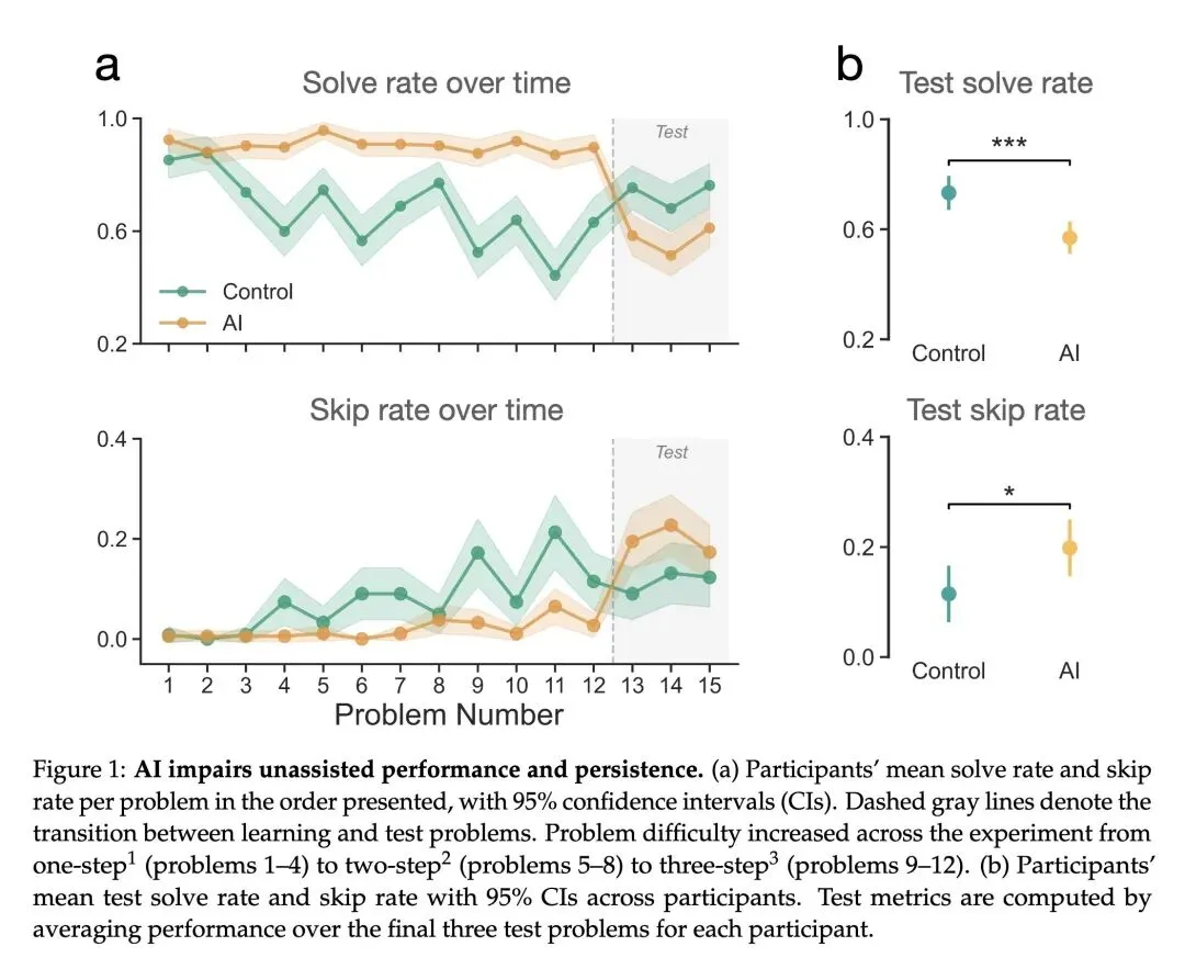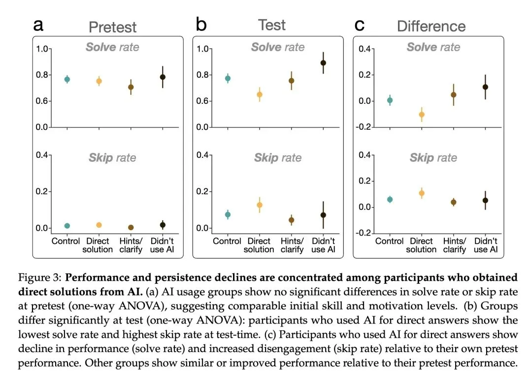 论文主要讨论的是人类能力的下降而非提升: 在有AI辅助的阶段,用户的短期解题率确实得到了提升。 但是,一旦撤去AI(无辅助测试),之前使用过AI(特别是直接要答案)的用户的解题率显著低于从未使用过AI的控制组(例如实验1中:57% vs 73%)。 用户的放弃率(skip rate)在失去AI后显著上升(例如实验1中:20% vs 11%)。