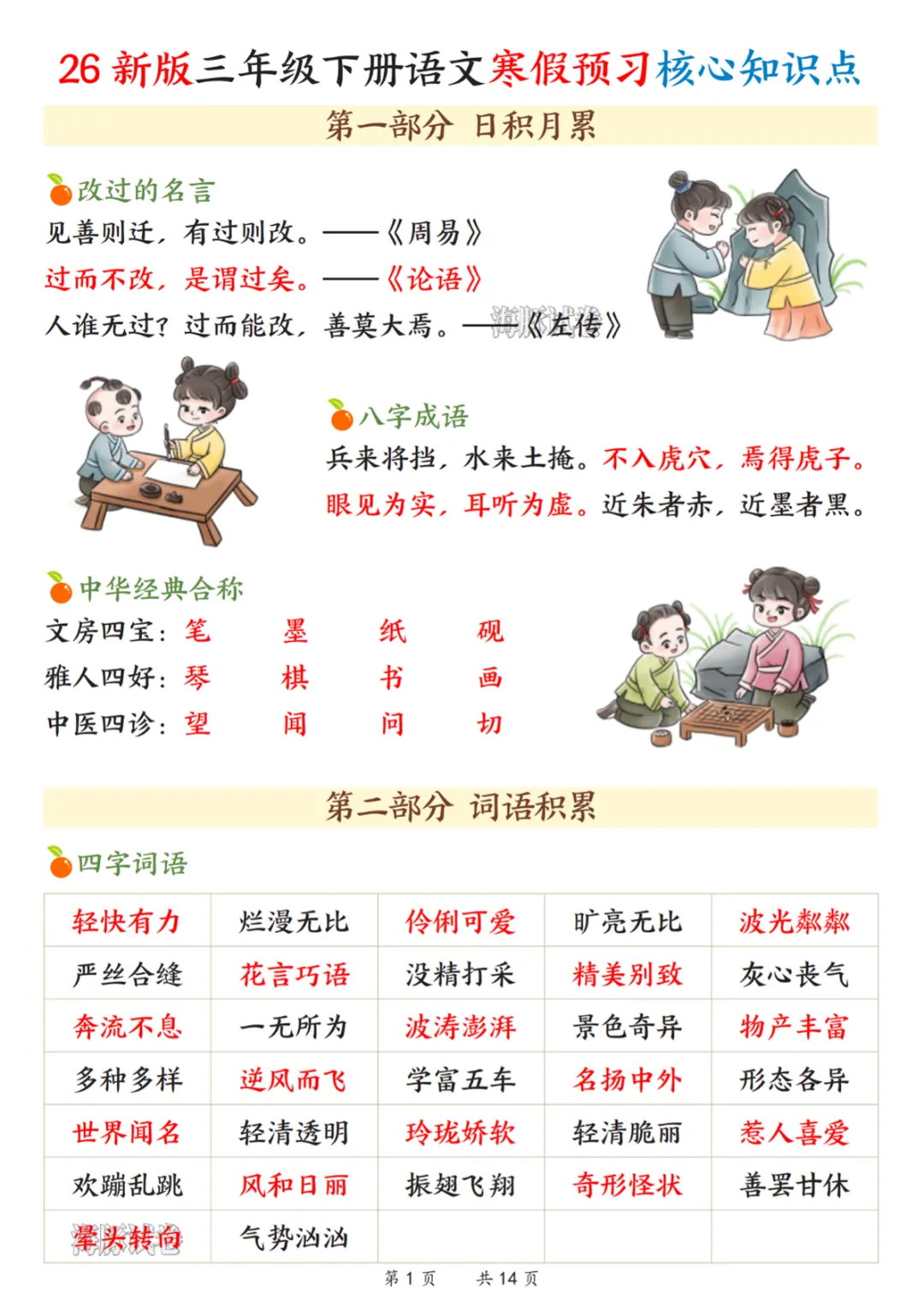 【免费下载】【海豚试卷】26新三年级(下)语文寒假预习核心知识点,PDF电子版,共14页,先保存,以免资源失效