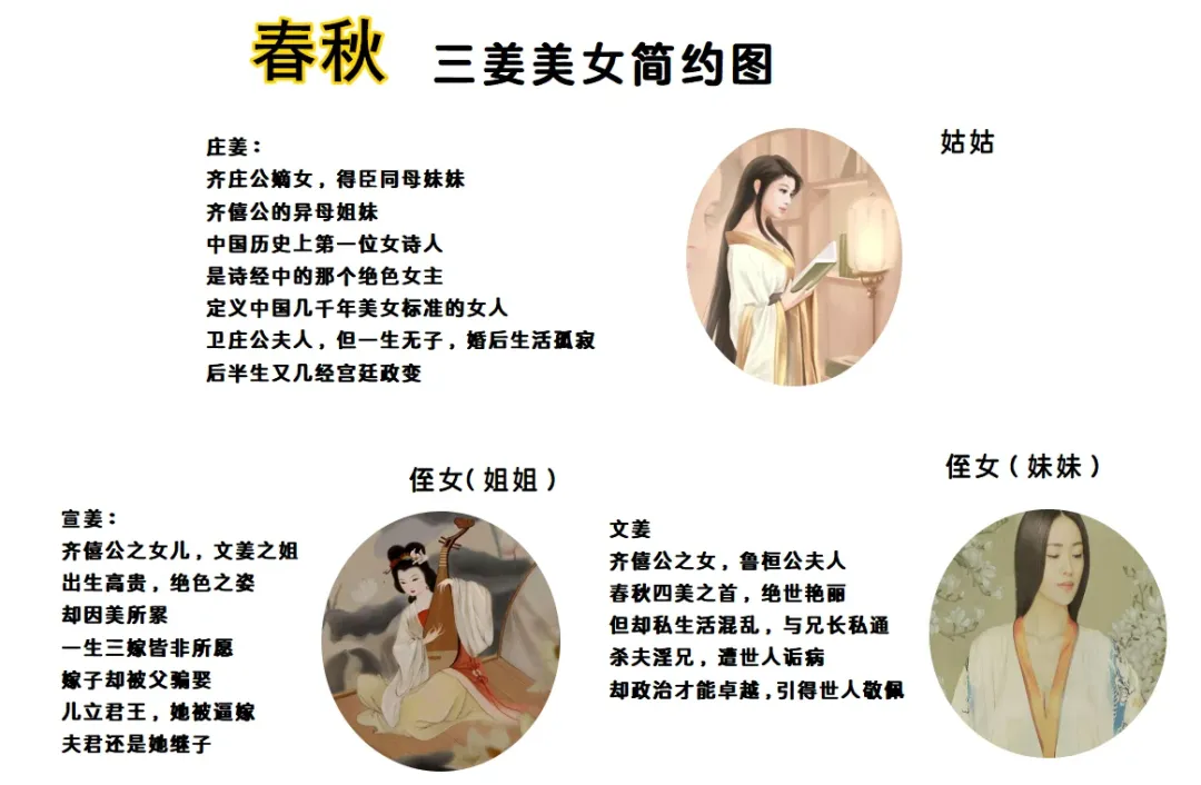 庄姜是春秋战国齐国公主,生活在公元前690年之前, 又名姜若兮。谥号庄,是齐庄公的嫡女,得臣的同母妹妹,齐僖公的异母姐妹,也是文姜和宣姜的姑姑。据说从庄姜开始,世人眼中对于美女的标准有了新的定义,之前的美女多因骄奢淫逸和一身妖气而留名,如妹喜妲己和褒姒,她们都是著名的“狐狸精”。但从庄姜开始,美女也有了好心肠。更可贵的是,庄姜并不是徒有虚表的花瓶,而是位才华出众的诗人,甚至还是中国第一位女诗人,有自己的诗歌代表作,《燕燕》《柏舟》《绿衣》等
