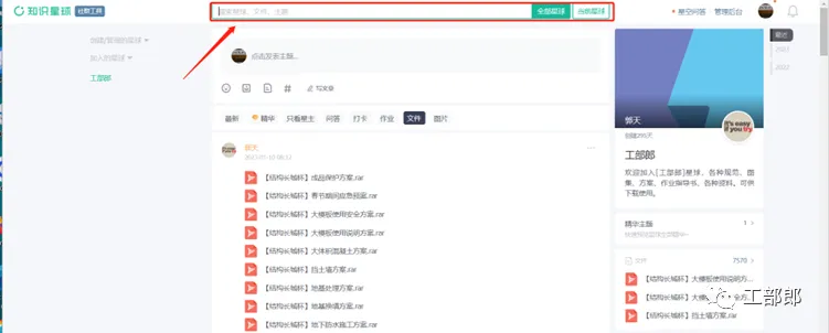 2、进入知识星球主页,页面顶部搜索栏可搜索关键词查找资料