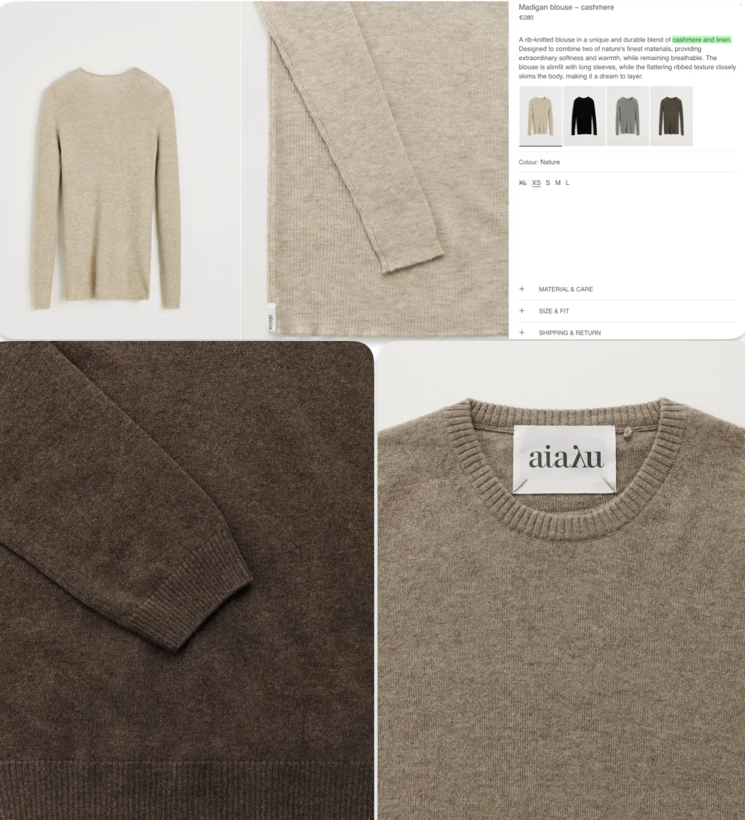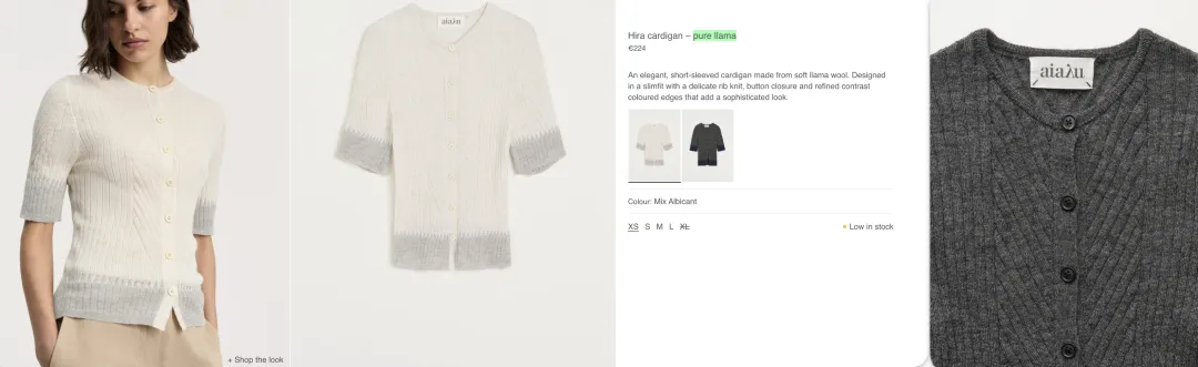 虽然品牌强调天然面料,但Aiayu在桑蚕丝袜和厚重的llama针织毛衣,还是有聚酯纤维存在来增加耐磨性