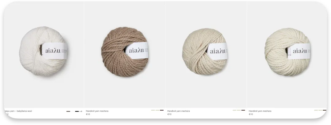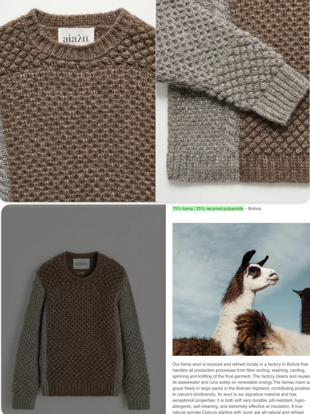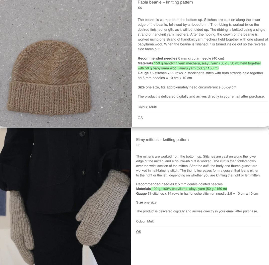 得益于Aiayu与玻利维亚工厂的长期深度合作,官网也跟Nomad Noos一样提供手工babyllama纱线,有100%babyllama和50%babyllama与50%Highlands Wool混纺面料