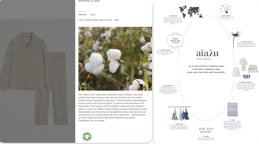Aiayu第二重视的面料就是印度有机棉,也深入当地工厂,保障员工福利,让工厂70%能源来自太阳能。边角料会再利用来做包包、衣服吊牌、床单等,这些有机棉也获得GOTS认证
