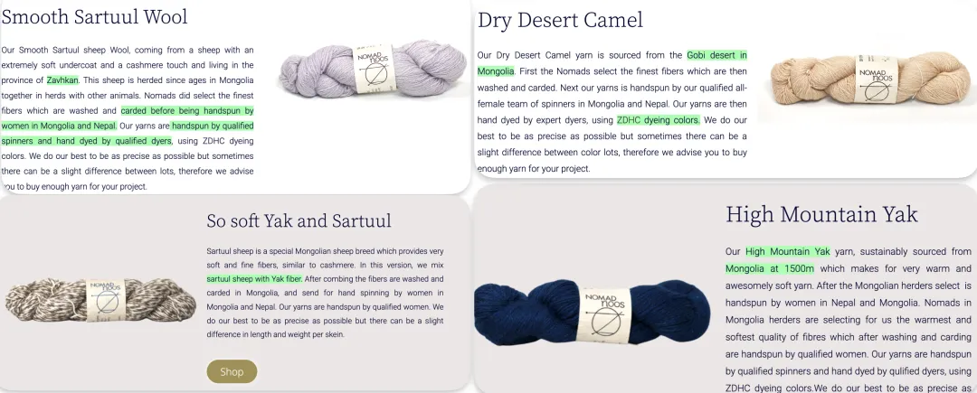 Satuul羊毛在Nomad Noos这家手工针织纱线品牌用得多,Nomad Noos的纤维原料全部来自蒙古,包括骆驼绒、牦牛绒、Satuul羊毛,最后也在Nepal进行纺纱