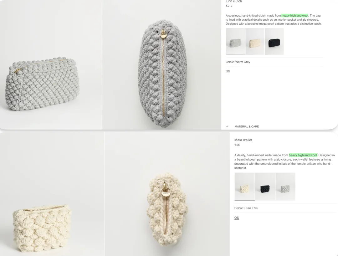从Helen Clutch的面料细节看,Aiayu的llama大羊驼毛还是很整齐的,llama跟Alpaca一样,天然纤维就有10多种颜色,Aiayu跟Araminta Campbell对这种面料都是不需要专门染色,只简单处理