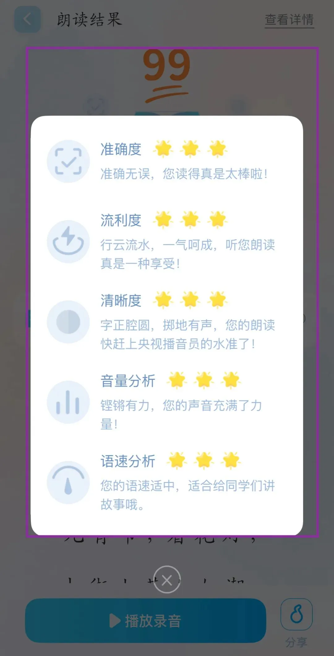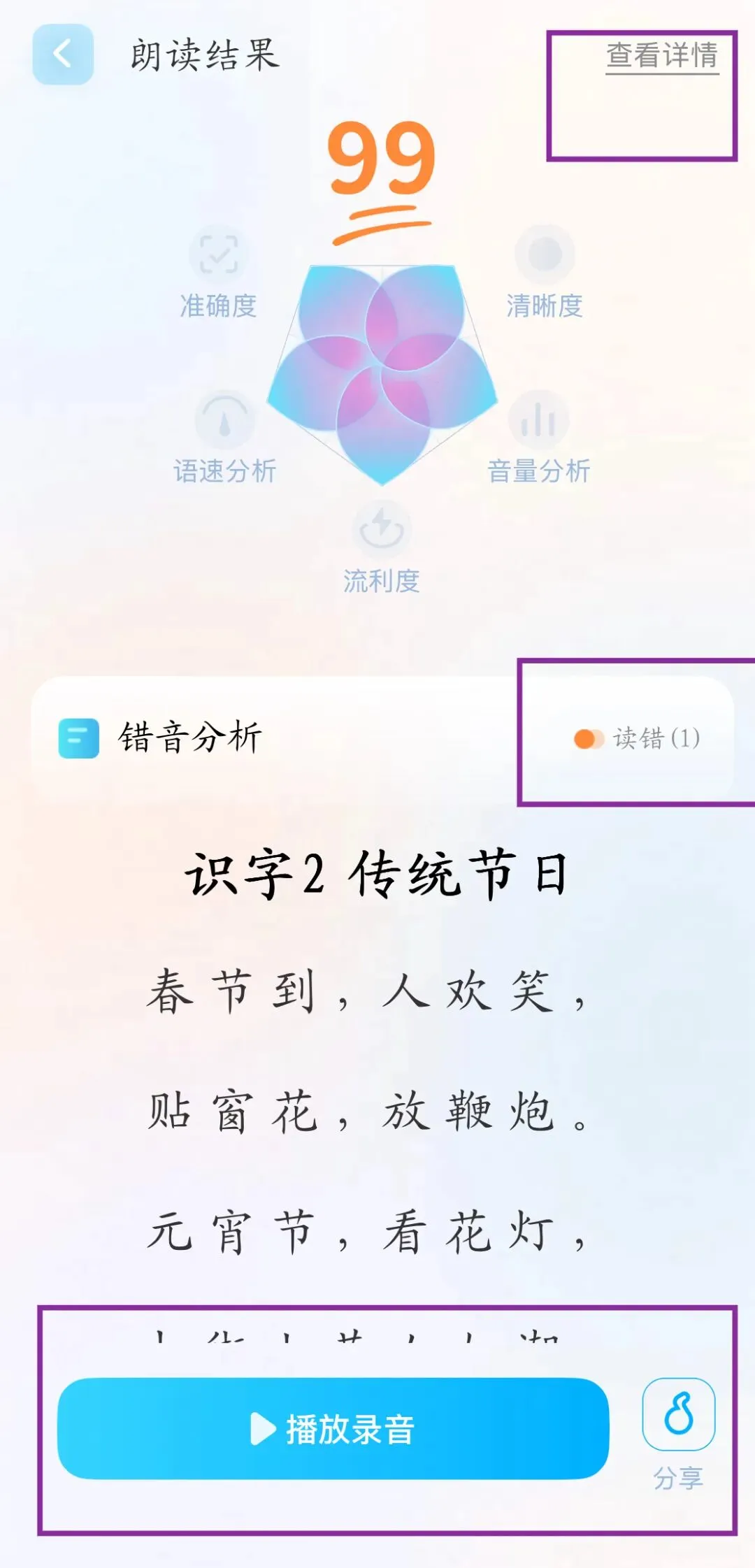 它最大的优点是即时评分、指出读错字,并且班级内的小伙伴可以互相查看朗读记录,彼此提醒、共同进步。