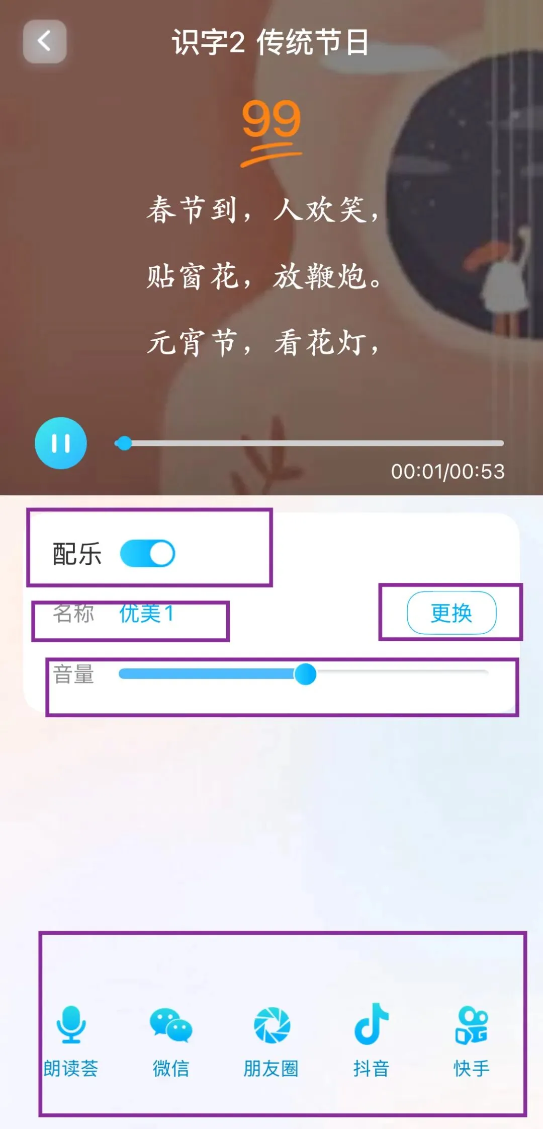 App提供标准范读,可反复尝试,朗读后即时评分,并精准指出读错的字词,也可以分享自己的作品。