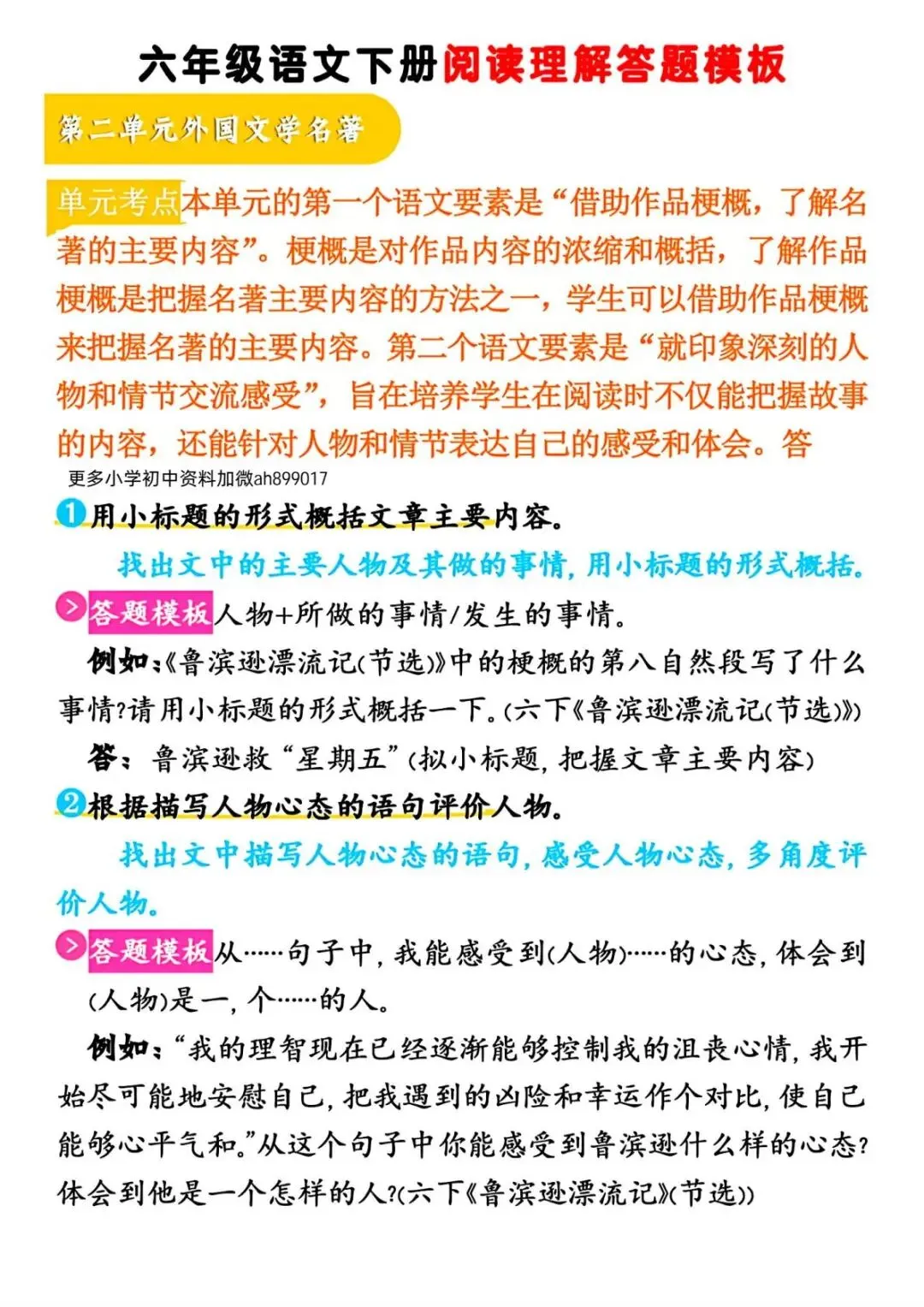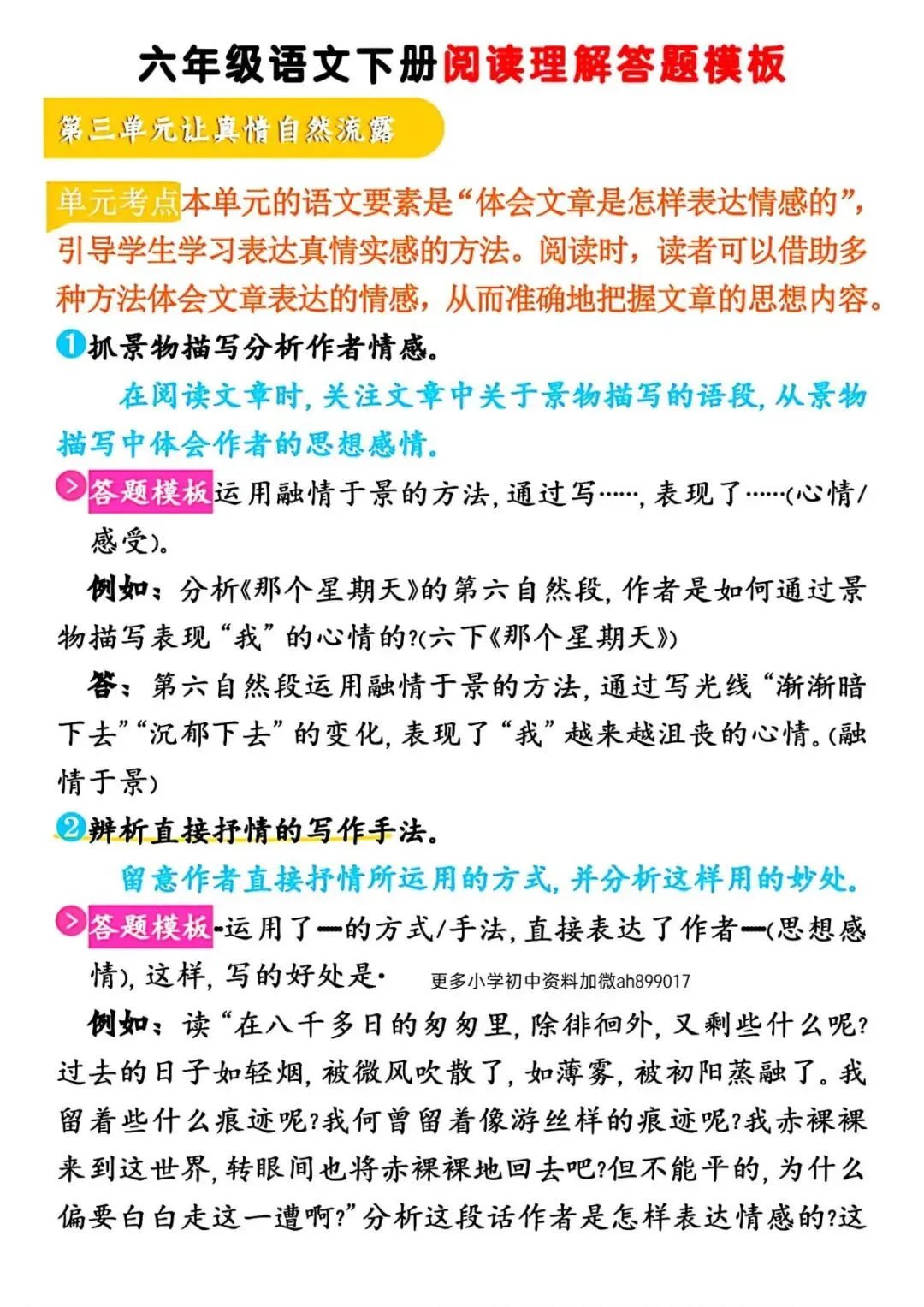今天给大家分享的是:六年级(下)语文 阅读理解答题模板,共14页,电子版可下载打印。文章末尾可直接领取全套电子版,无套路,欢迎收藏和下载。如果觉得这份资料不错,建议分享到班级群/年级群,让其他家长打印出来,帮助孩子学习;如果觉得合适,请支持正版!
