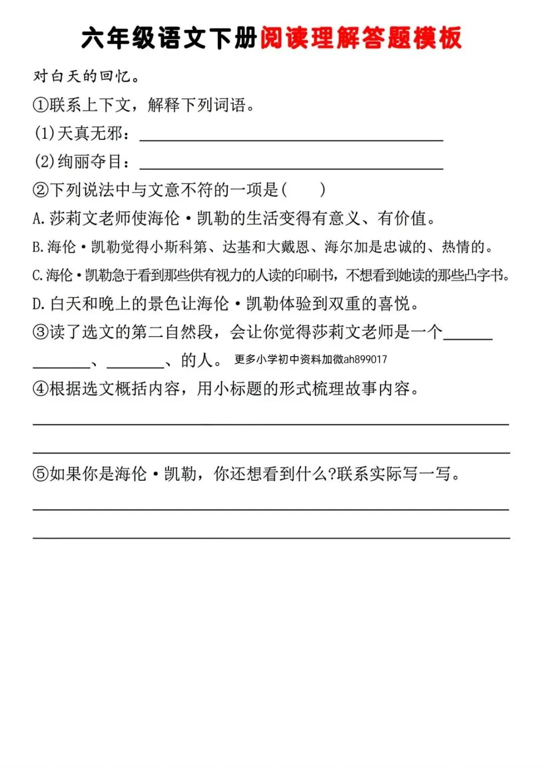 六年级(下)语文 阅读理解答题模板