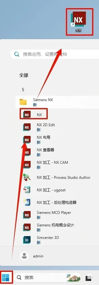 25..创建桌面快捷方式:①点击桌面任务栏中的”开始图标“>点击”所有应用“>双击展开”Siemens NX“文件夹②将”NX“图标拖到电脑桌面。