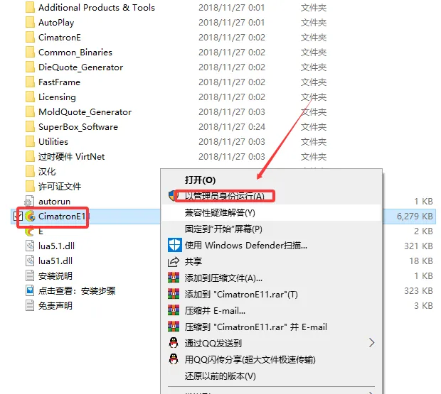 2.打开解压好的安装包,找到CimatronE11程序,点击鼠标右键选择以管理员身份运行