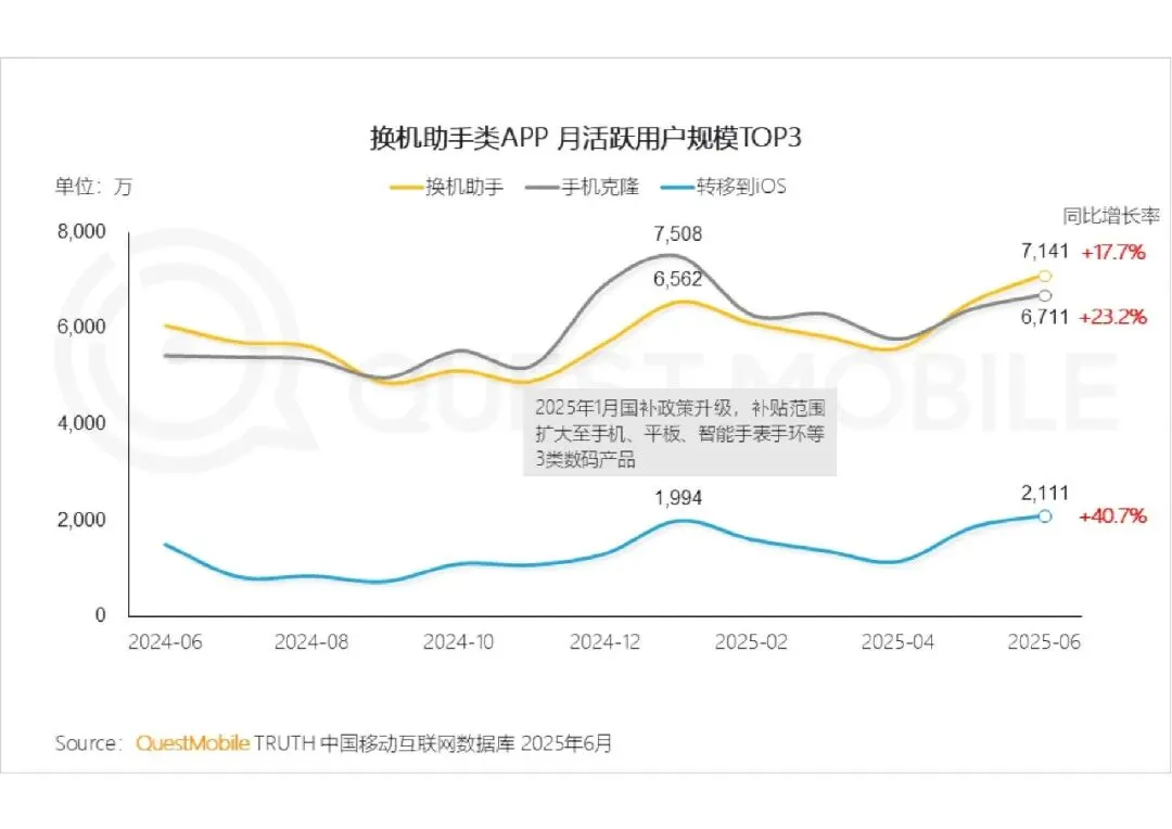 2025 年国内智能手机市场换机需求显著提升,国补政策成为关键引擎。1 月国补范围扩至手机、平板、智能手表手环三类数码产品,叠加 618 大促,1 月与 6 月形成两大换机高峰,换机助手类 APP 月活同比大幅增长,印证市场活跃度提升。
