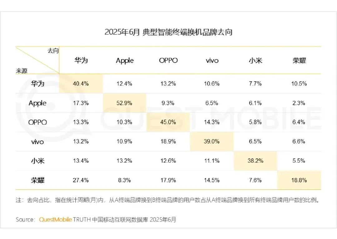换机流向呈现高留存、强分化特征:苹果用户留存率 52.9%,华为 40.4%,OPPO 45.0%,vivo 39.0%,小米 38.2%,头部品牌生态壁垒显著;跨品牌流向中,荣耀用户 27.4% 转向华为,苹果用户 17.3% 转向华为,国产高端对苹果用户形成有效分流,品牌忠诚度与跨品牌吸引力分化加剧。