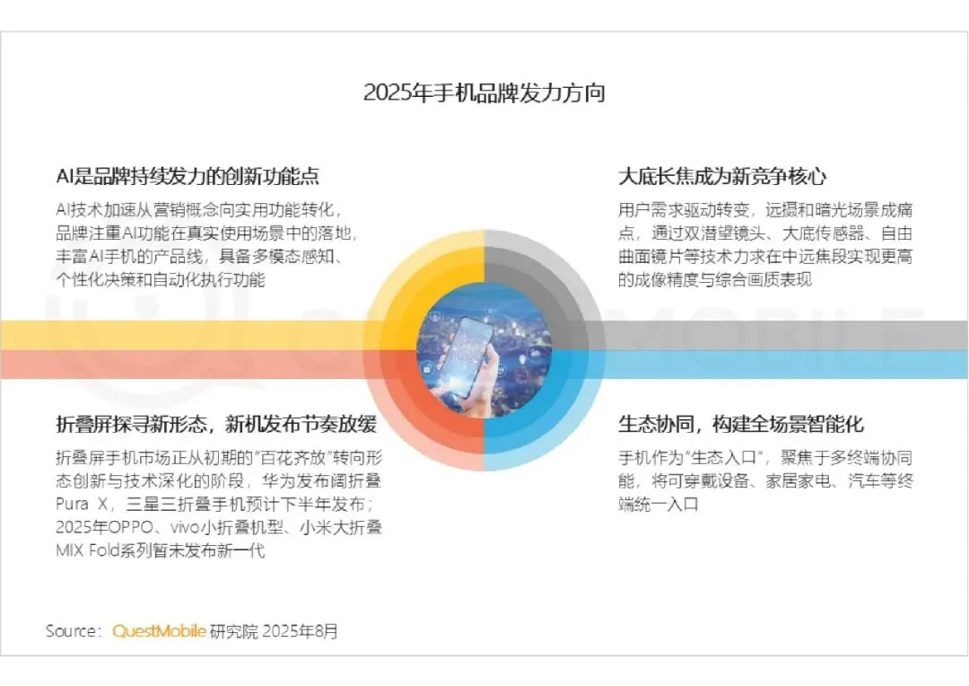 硬件创新聚焦两大方向:一是折叠屏从盲目扩张转向技术深耕,华为、三星发力形态创新,OPPO、vivo、小米放缓发布节奏,注重技术打磨;二是大底长焦成为影像竞争核心,双潜望镜头、大底传感器等技术提升远摄与暗光画质。