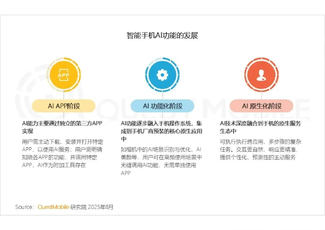 QuestMobile《2025 中国智能手机市场洞察报告》显示,国补政策与 618 大促有效激活换机需求,AI 手机成为核心创新方向,品牌竞争从硬件参数比拼转向 AI 能力、生态协同与圈层营销的综合较量,国产阵营整体走强,市场呈现换机回暖、AI 渗透、格局固化、生态深化四大特征。