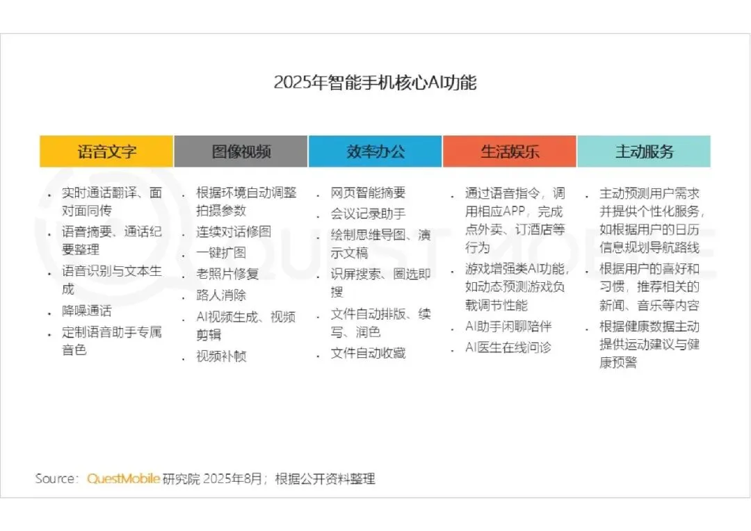 AI 功能覆盖语音文字、图像视频、效率办公、生活娱乐、主动服务五大场景,实时翻译、智能修图、会议助手、主动推荐等实用功能普及,推动用户体验质变。