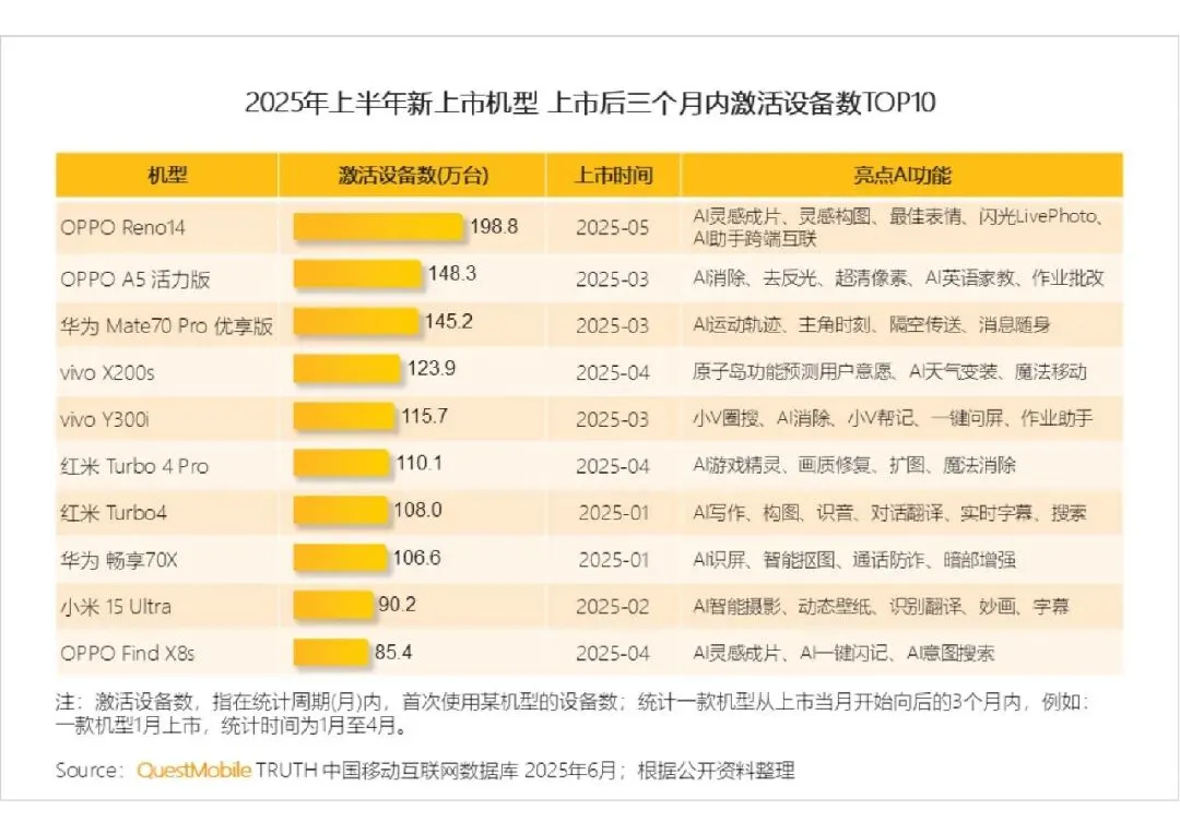 新机型激活量 TOP10 被 OPPO、华为、vivo、小米包揽,AI 功能成为拉动销量的核心卖点,技术实力直接影响市场表现。